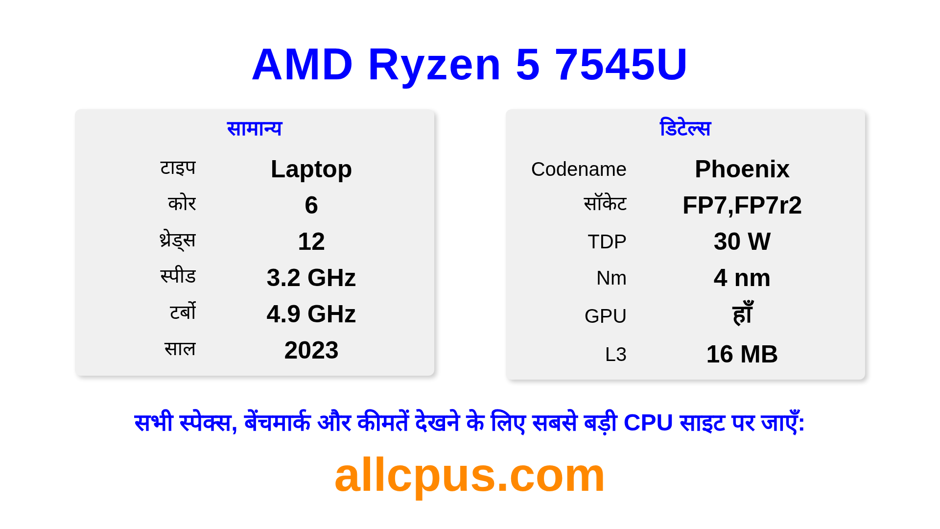 AMD Ryzen 5 7545U Ryzen लाइनअप का AMD लैपटॉप प्रोसेसर है, Phoenix आर्किटेक्चर पर आधारित और 2023 में जारी किया गया। इस CPU में 6 कोर, बेस क्लॉक 3200 MHz, अधिकतम टर्बो फ्रीक्वेंसी 4900 MHz और 16 MB L3 कैश है। 4 nm प्रोसेस टेक्नोलॉजी का उपयोग करके निर्मित। AMD Ryzen 5 7545U FP7,FP7r2 सॉकेट के लिए डिज़ाइन किया गया है। इसमें इंटीग्रेटेड AMD Radeon 740M ग्राफिक्स शामिल है।