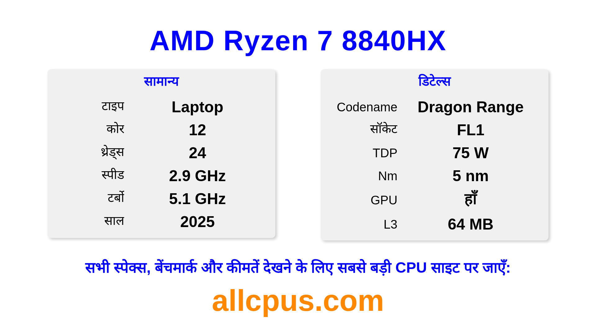 AMD Ryzen 7 8840HX Ryzen लाइनअप का AMD लैपटॉप प्रोसेसर है, Dragon Range आर्किटेक्चर पर आधारित और 2025 में जारी किया गया। इस CPU में 12 कोर, बेस क्लॉक 2900 MHz, अधिकतम टर्बो फ्रीक्वेंसी 5100 MHz और 64 MB L3 कैश है। 5 nm प्रोसेस टेक्नोलॉजी का उपयोग करके निर्मित। AMD Ryzen 7 8840HX FL1 सॉकेट के लिए डिज़ाइन किया गया है।यह ओवरक्लॉकिंग को सपोर्ट करता है। इसमें इंटीग्रेटेड AMD Radeon 610M ग्राफिक्स शामिल है।