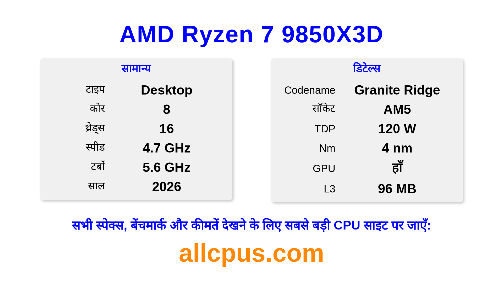 AMD Ryzen 7 9850X3D Ryzen लाइनअप का AMD डेस्कटॉप प्रोसेसर है, Granite Ridge आर्किटेक्चर पर आधारित और 2026 में जारी किया गया। इस CPU में 8 कोर, बेस क्लॉक 4700 MHz, अधिकतम टर्बो फ्रीक्वेंसी 5600 MHz और 96 MB L3 कैश है। 4 nm प्रोसेस टेक्नोलॉजी का उपयोग करके निर्मित। AMD Ryzen 7 9850X3D AM5 सॉकेट के लिए डिज़ाइन किया गया है।यह ओवरक्लॉकिंग को सपोर्ट करता है। इसमें इंटीग्रेटेड AMD Radeon Graphics ग्राफिक्स शामिल है।