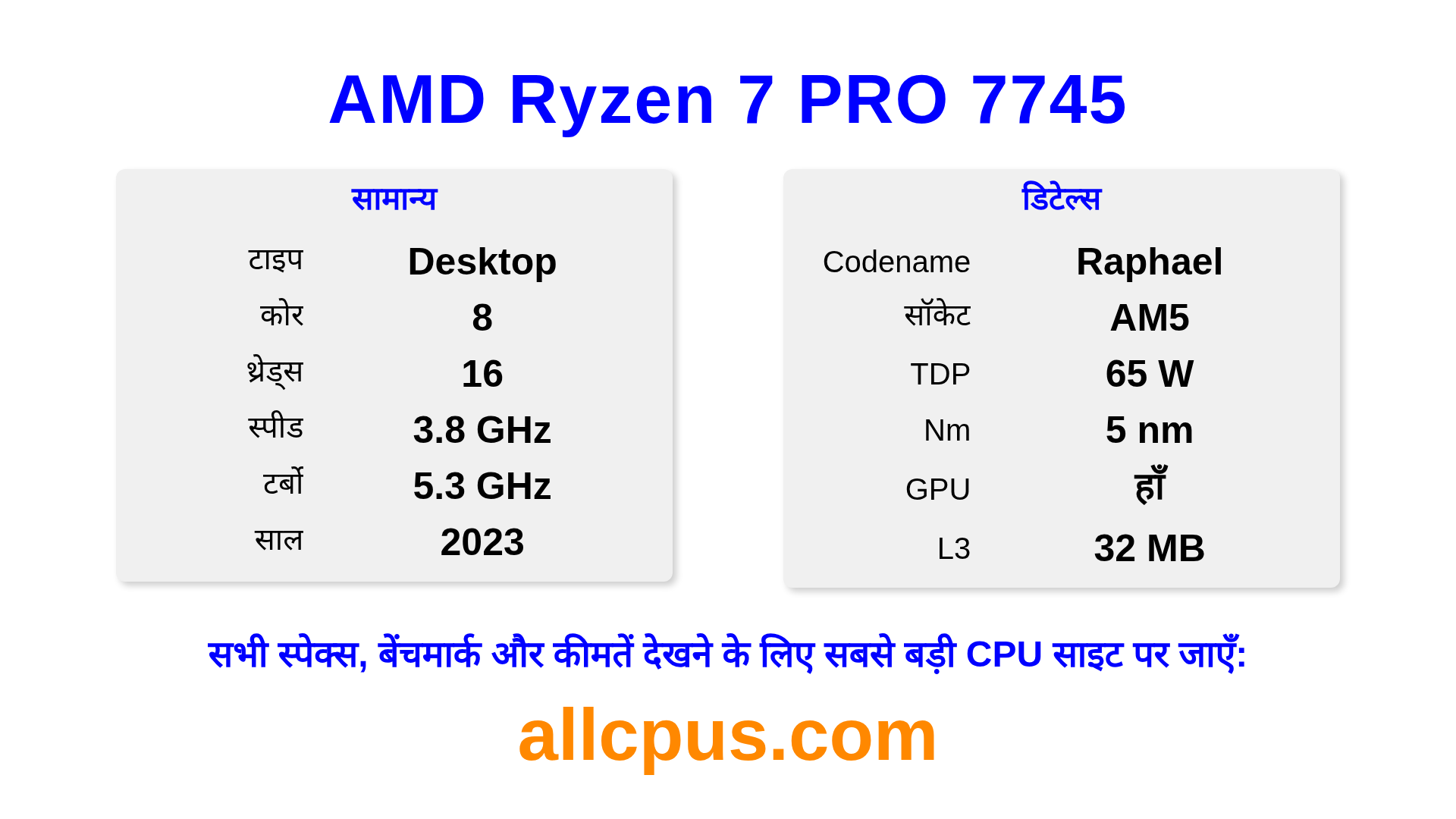 AMD Ryzen 7 PRO 7745 Ryzen PRO लाइनअप का AMD डेस्कटॉप प्रोसेसर है, Raphael आर्किटेक्चर पर आधारित और 2023 में जारी किया गया। इस CPU में 8 कोर, बेस क्लॉक 3800 MHz, अधिकतम टर्बो फ्रीक्वेंसी 5300 MHz और 32 MB L3 कैश है। 5 nm प्रोसेस टेक्नोलॉजी का उपयोग करके निर्मित। AMD Ryzen 7 PRO 7745 AM5 सॉकेट के लिए डिज़ाइन किया गया है। इसमें इंटीग्रेटेड AMD Radeon Graphics ग्राफिक्स शामिल है।