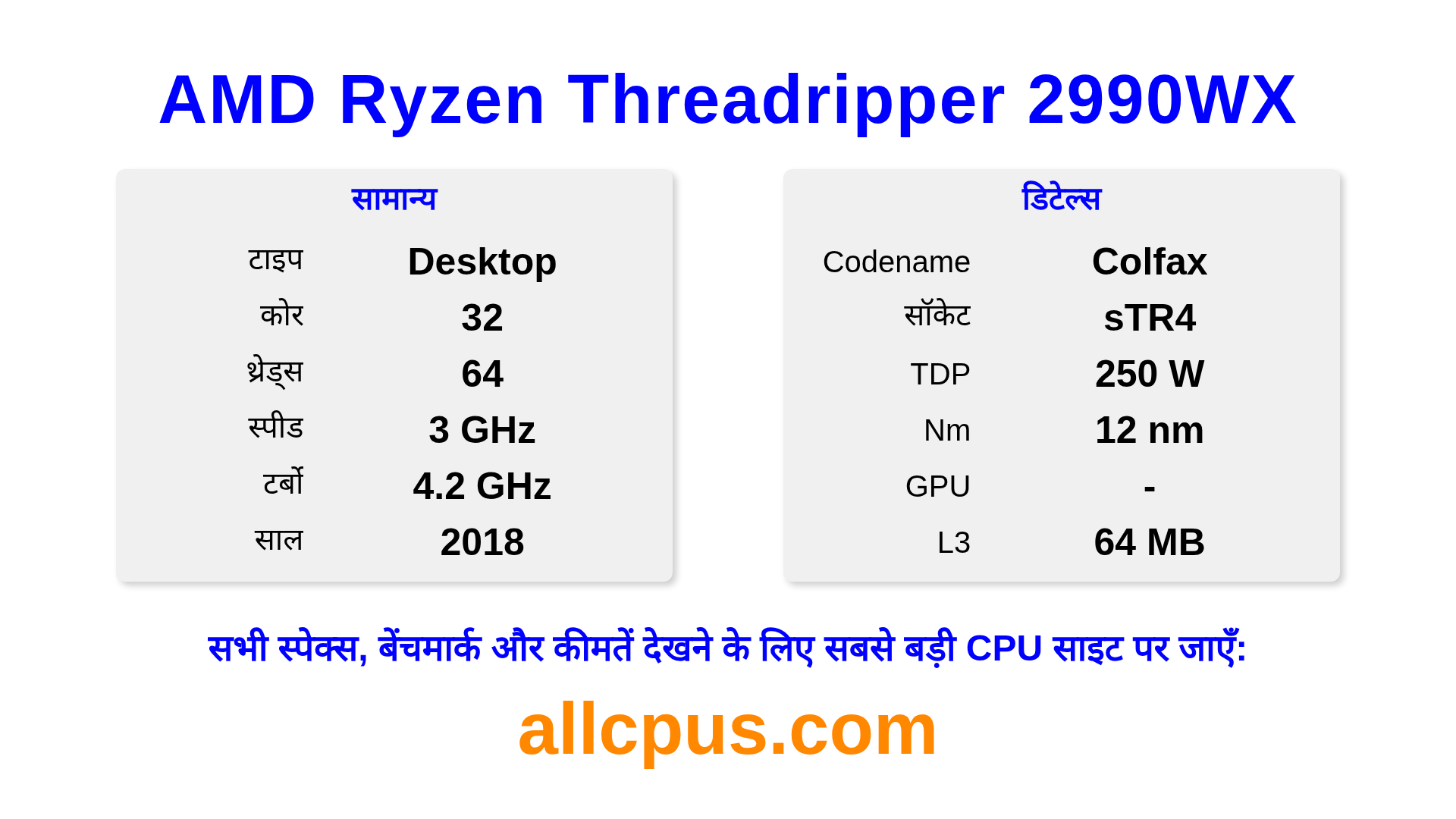 AMD Ryzen Threadripper 2990WX Ryzen Threadripper लाइनअप का AMD डेस्कटॉप प्रोसेसर है, Colfax आर्किटेक्चर पर आधारित और 2018 में जारी किया गया। इस CPU में 32 कोर, बेस क्लॉक 3000 MHz, अधिकतम टर्बो फ्रीक्वेंसी 4200 MHz और 64 MB L3 कैश है। 12 nm प्रोसेस टेक्नोलॉजी का उपयोग करके निर्मित। AMD Ryzen Threadripper 2990WX sTR4 सॉकेट के लिए डिज़ाइन किया गया है।यह ओवरक्लॉकिंग को सपोर्ट करता है। इसके लिए डेडिकेटेड ग्राफिक्स कार्ड की आवश्यकता है।