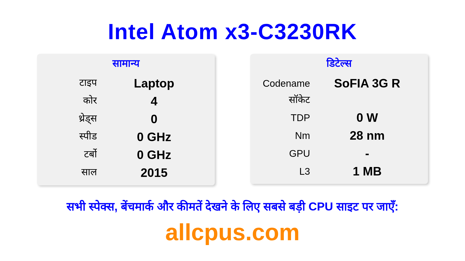 Intel Atom x3-C3230RK Intel Atom Processor Family लाइनअप का Intel लैपटॉप प्रोसेसर है, SoFIA 3G R आर्किटेक्चर पर आधारित और 2015 में जारी किया गया। इस CPU में 4 कोर, बेस क्लॉक 0 MHz, अधिकतम टर्बो फ्रीक्वेंसी 0 MHz और 1 MB L3 कैश है। 28 nm प्रोसेस टेक्नोलॉजी का उपयोग करके निर्मित। Intel Atom x3-C3230RK सॉकेट के लिए डिज़ाइन किया गया है।यह ओवरक्लॉकिंग को सपोर्ट करता है। इसके लिए डेडिकेटेड ग्राफिक्स कार्ड की आवश्यकता है।
