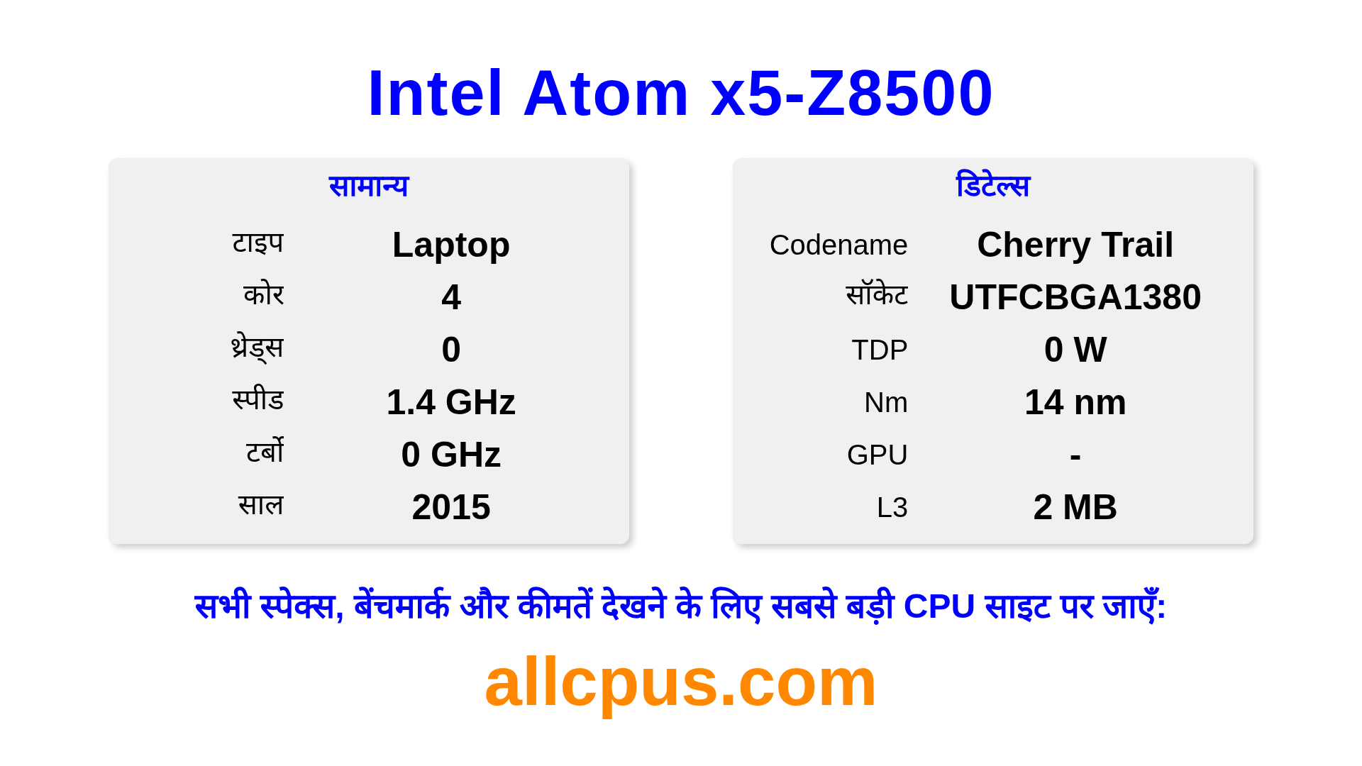 Intel Atom x5-Z8500 Intel Atom Processor Family लाइनअप का Intel लैपटॉप प्रोसेसर है, Cherry Trail आर्किटेक्चर पर आधारित और 2015 में जारी किया गया। इस CPU में 4 कोर, बेस क्लॉक 1440 MHz, अधिकतम टर्बो फ्रीक्वेंसी 0 MHz और 2 MB L3 कैश है। 14 nm प्रोसेस टेक्नोलॉजी का उपयोग करके निर्मित। Intel Atom x5-Z8500 UTFCBGA1380 सॉकेट के लिए डिज़ाइन किया गया है। इसके लिए डेडिकेटेड ग्राफिक्स कार्ड की आवश्यकता है।