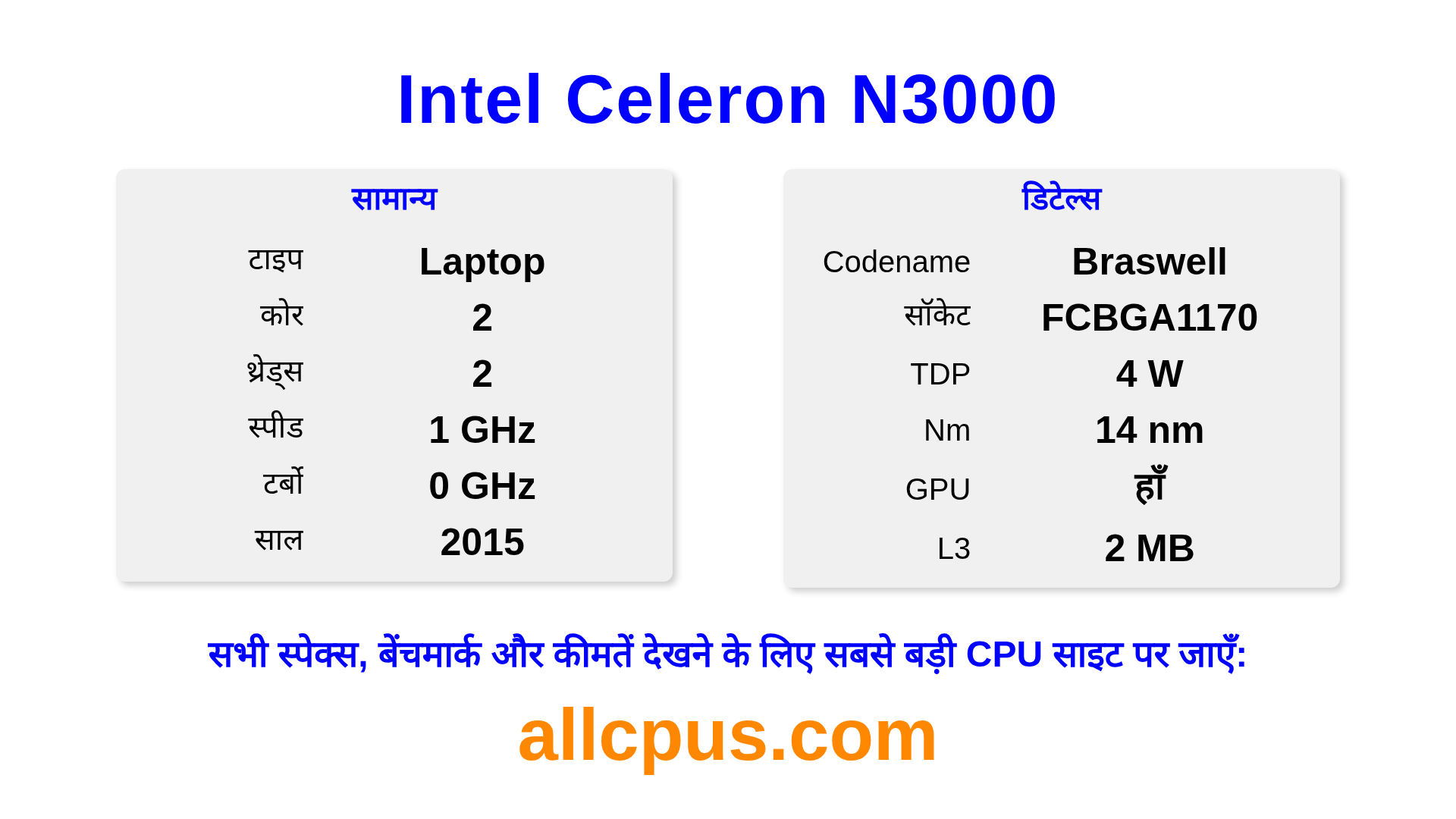 Intel Celeron N3000 Intel® Celeron® लाइनअप का Intel लैपटॉप प्रोसेसर है, Braswell आर्किटेक्चर पर आधारित और 2015 में जारी किया गया। इस CPU में 2 कोर, बेस क्लॉक 1040 MHz, अधिकतम टर्बो फ्रीक्वेंसी 0 MHz और 2 MB L3 कैश है। 14 nm प्रोसेस टेक्नोलॉजी का उपयोग करके निर्मित। Intel Celeron N3000 BGA1170 सॉकेट के लिए डिज़ाइन किया गया है। इसमें इंटीग्रेटेड Intel® HD Graphics for Intel® Celeron® Processor N3000 Series ग्राफिक्स शामिल है।