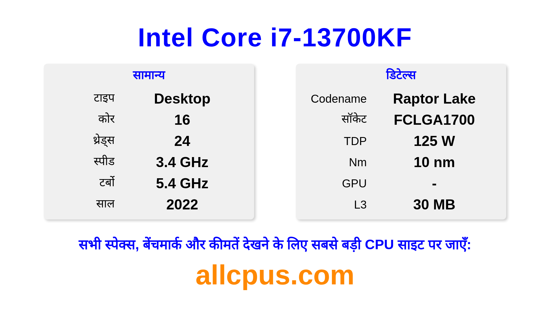 Intel Core i7-13700KF Intel Core लाइनअप का Intel डेस्कटॉप प्रोसेसर है, Raptor Lake आर्किटेक्चर पर आधारित और 2022 में जारी किया गया। इस CPU में 16 कोर, बेस क्लॉक 3400 MHz, अधिकतम टर्बो फ्रीक्वेंसी 5400 MHz और 30 MB L3 कैश है। 10 nm प्रोसेस टेक्नोलॉजी का उपयोग करके निर्मित। Intel Core i7-13700KF LGA1700 सॉकेट के लिए डिज़ाइन किया गया है। इसके लिए डेडिकेटेड ग्राफिक्स कार्ड की आवश्यकता है।