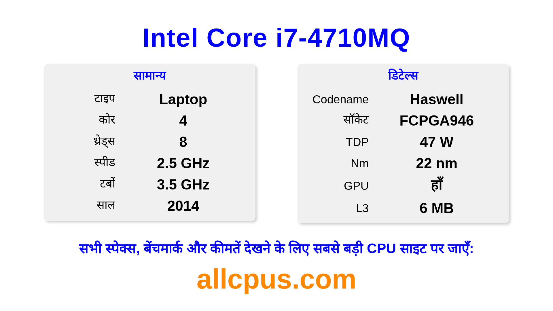Intel Core i7-4710MQ Intel Core लाइनअप का Intel लैपटॉप प्रोसेसर है, Haswell आर्किटेक्चर पर आधारित और 2014 में जारी किया गया। इस CPU में 4 कोर, बेस क्लॉक 2500 MHz, अधिकतम टर्बो फ्रीक्वेंसी 3500 MHz और 6 MB L3 कैश है। 22 nm प्रोसेस टेक्नोलॉजी का उपयोग करके निर्मित। Intel Core i7-4710MQ PGA946 सॉकेट के लिए डिज़ाइन किया गया है। इसमें इंटीग्रेटेड Intel® HD Graphics 4600 ग्राफिक्स शामिल है।