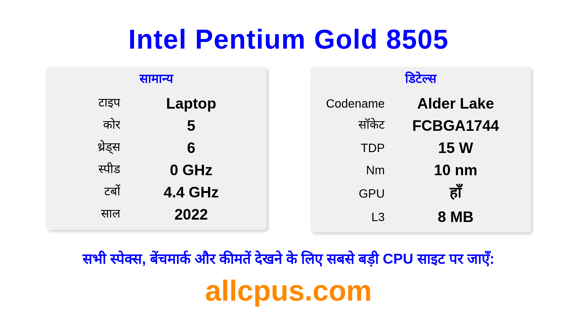 Intel Pentium Gold 8505 Intel® Pentium® Gold लाइनअप का Intel लैपटॉप प्रोसेसर है, Alder Lake आर्किटेक्चर पर आधारित और 2022 में जारी किया गया। इस CPU में 5 कोर, बेस क्लॉक 0 MHz, अधिकतम टर्बो फ्रीक्वेंसी 4400 MHz और 8 MB L3 कैश है। 10 nm प्रोसेस टेक्नोलॉजी का उपयोग करके निर्मित। Intel Pentium Gold 8505 BGA1744 सॉकेट के लिए डिज़ाइन किया गया है। इसमें इंटीग्रेटेड Intel® UHD Graphics for 12th Gen Intel® Processors ग्राफिक्स शामिल है।