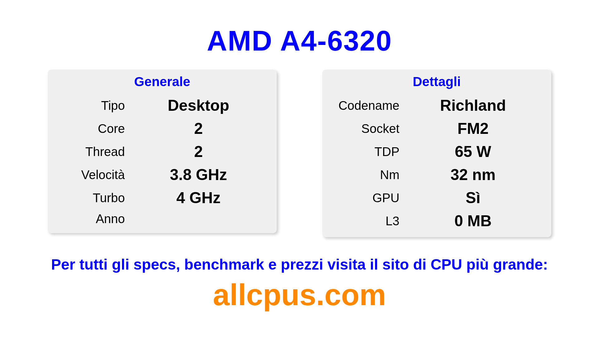 Il AMD A4-6320 è un AMD processore desktop della linea A-Series, costruito sull’architettura Richland e rilasciato nel . Questa CPU ha 2 core, una frequenza base di 3800 MHz, frequenza turbo massima di 4000 MHz e 0 MB di cache L3. Prodotto usando tecnologia di processo a 32 nm.Il AMD A4-6320 è progettato per il socket FM2. Include la grafica integrata AMD Radeon HD 8370D.