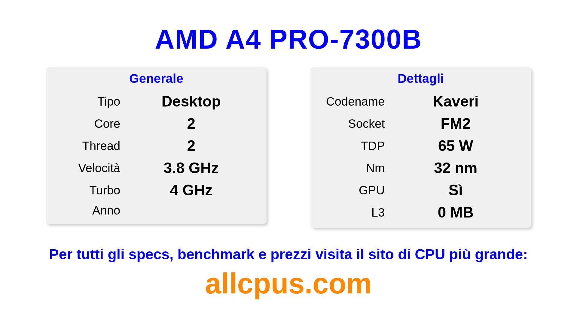 Il AMD A4 PRO-7300B è un AMD processore desktop della linea PRO A-Series, costruito sull’architettura Kaveri e rilasciato nel . Questa CPU ha 2 core, una frequenza base di 3800 MHz, frequenza turbo massima di 4000 MHz e 0 MB di cache L3. Prodotto usando tecnologia di processo a 32 nm.Il AMD A4 PRO-7300B è progettato per il socket FM2. Include la grafica integrata AMD Radeon HD 8470D.