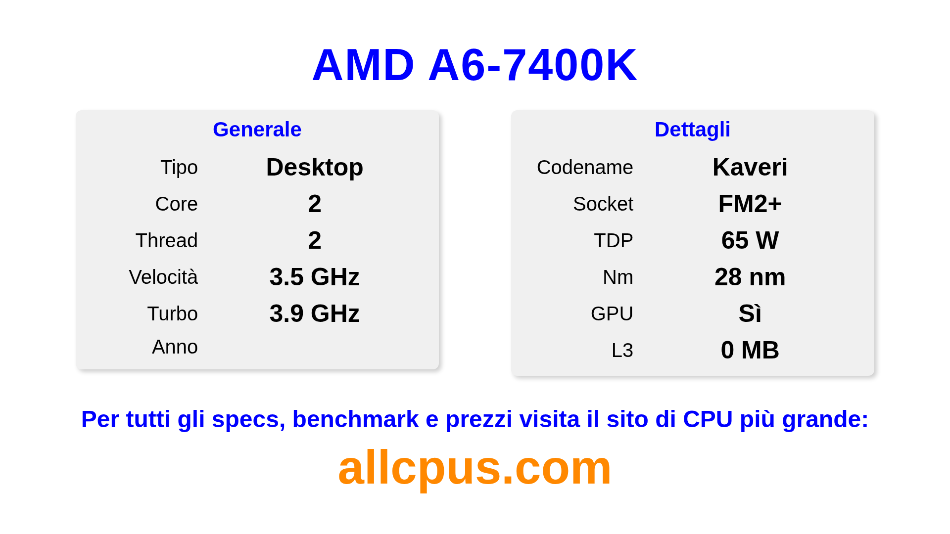 Il AMD A6-7400K è un AMD processore desktop della linea A-Series, costruito sull’architettura Kaveri e rilasciato nel . Questa CPU ha 2 core, una frequenza base di 3500 MHz, frequenza turbo massima di 3900 MHz e 0 MB di cache L3. Prodotto usando tecnologia di processo a 28 nm.Il AMD A6-7400K è progettato per il socket FM2+.Supporta l’overclock. Include la grafica integrata AMD Radeon R5 Graphics.