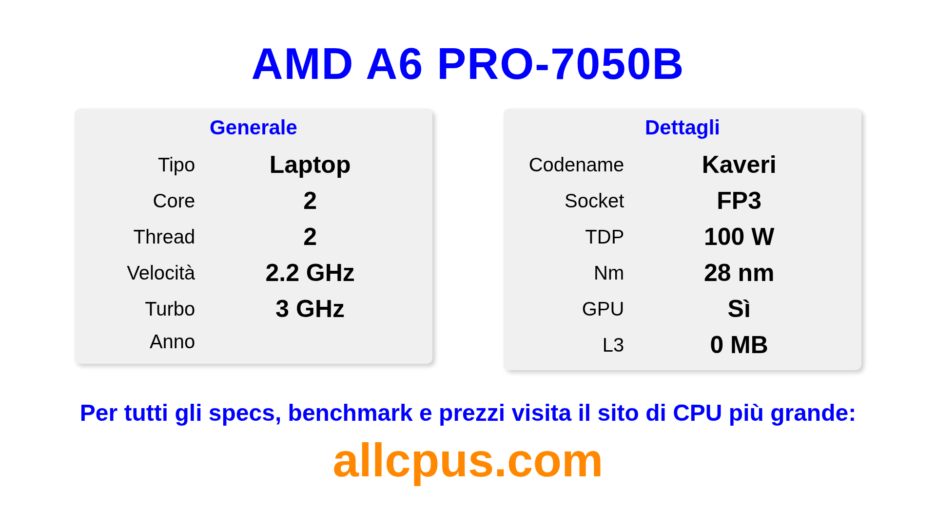 Il AMD A6 PRO-7050B è un AMD processore laptop della linea PRO A-Series, costruito sull’architettura Kaveri e rilasciato nel . Questa CPU ha 2 core, una frequenza base di 2200 MHz, frequenza turbo massima di 3000 MHz e 0 MB di cache L3. Prodotto usando tecnologia di processo a 28 nm.Il AMD A6 PRO-7050B è progettato per il socket FP3. Include la grafica integrata AMD Radeon R4 Graphics.
