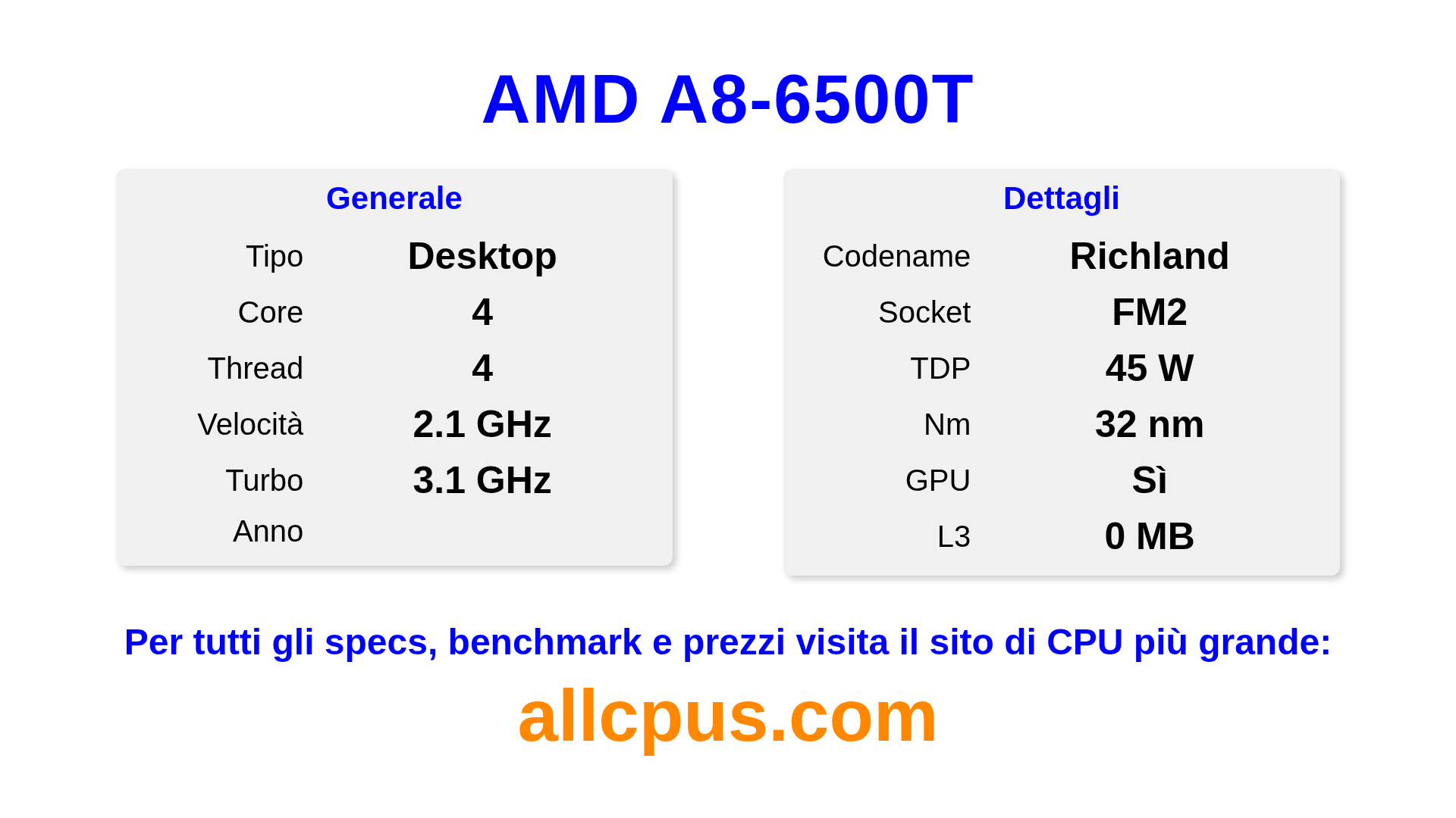 Il AMD A8-6500T è un AMD processore desktop della linea A-Series, costruito sull’architettura Richland e rilasciato nel . Questa CPU ha 4 core, una frequenza base di 2100 MHz, frequenza turbo massima di 3100 MHz e 0 MB di cache L3. Prodotto usando tecnologia di processo a 32 nm.Il AMD A8-6500T è progettato per il socket FM2. Include la grafica integrata AMD Radeon HD 8550D.