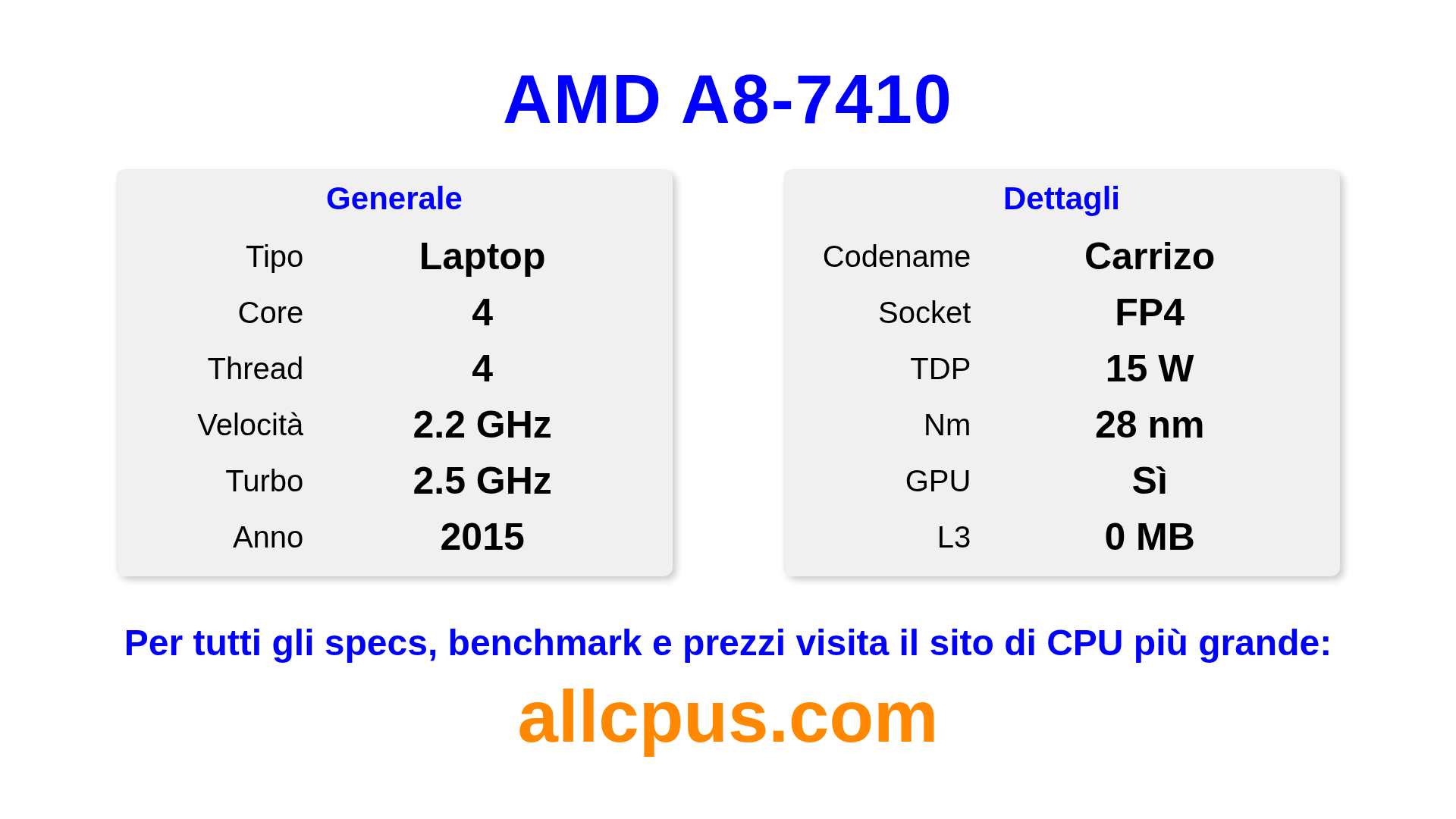 Il AMD A8-7410 è un AMD processore laptop della linea A-Series, costruito sull’architettura Carrizo e rilasciato nel 2015. Questa CPU ha 4 core, una frequenza base di 2200 MHz, frequenza turbo massima di 2500 MHz e 0 MB di cache L3. Prodotto usando tecnologia di processo a 28 nm.Il AMD A8-7410 è progettato per il socket FP4. Include la grafica integrata AMD Radeon R5 Graphics.