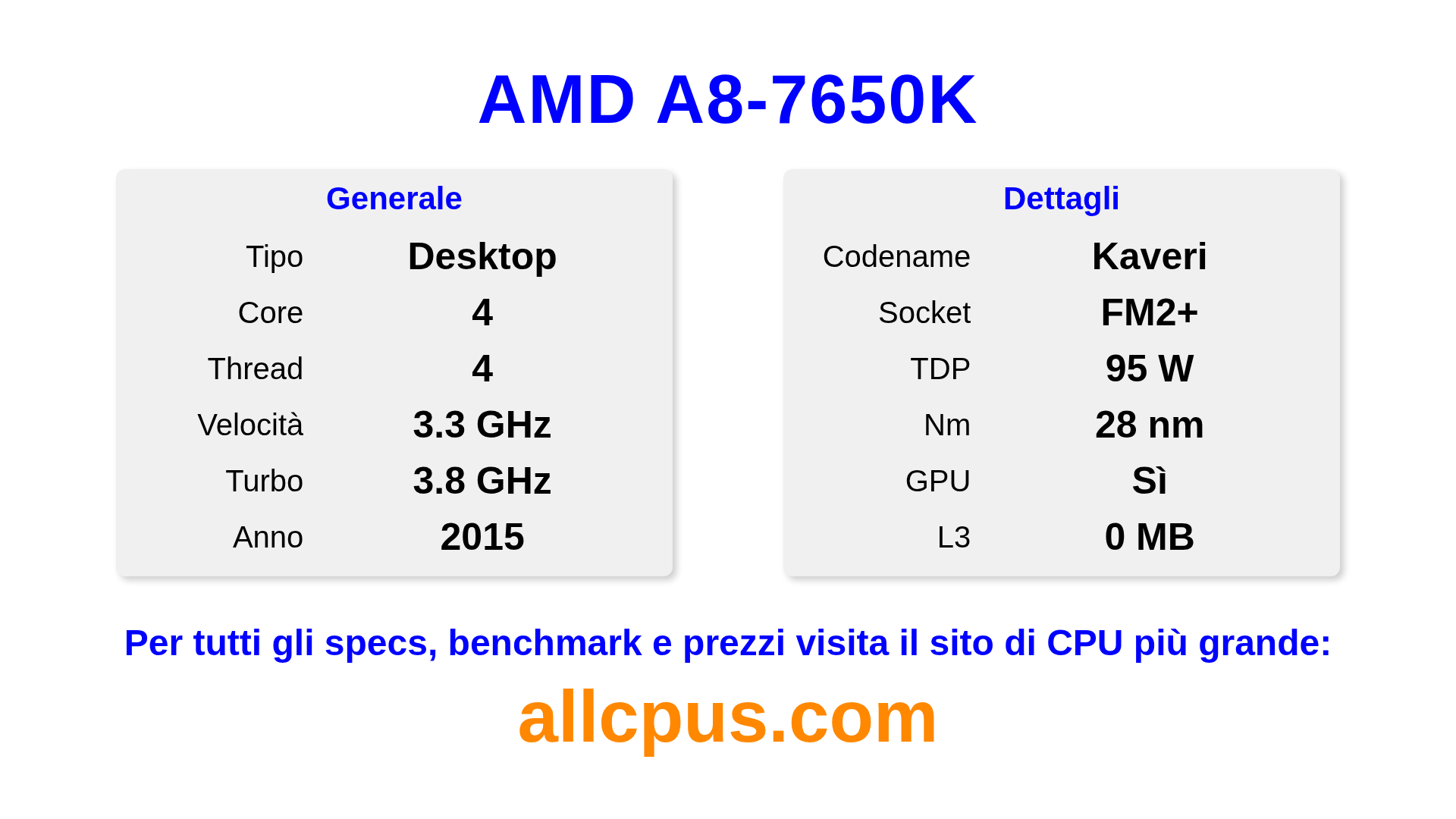 Il AMD A8-7650K è un AMD processore desktop della linea A-Series, costruito sull’architettura Kaveri e rilasciato nel 2015. Questa CPU ha 4 core, una frequenza base di 3300 MHz, frequenza turbo massima di 3800 MHz e 0 MB di cache L3. Prodotto usando tecnologia di processo a 28 nm.Il AMD A8-7650K è progettato per il socket FM2+.Supporta l’overclock. Include la grafica integrata AMD Radeon R7 Graphics.