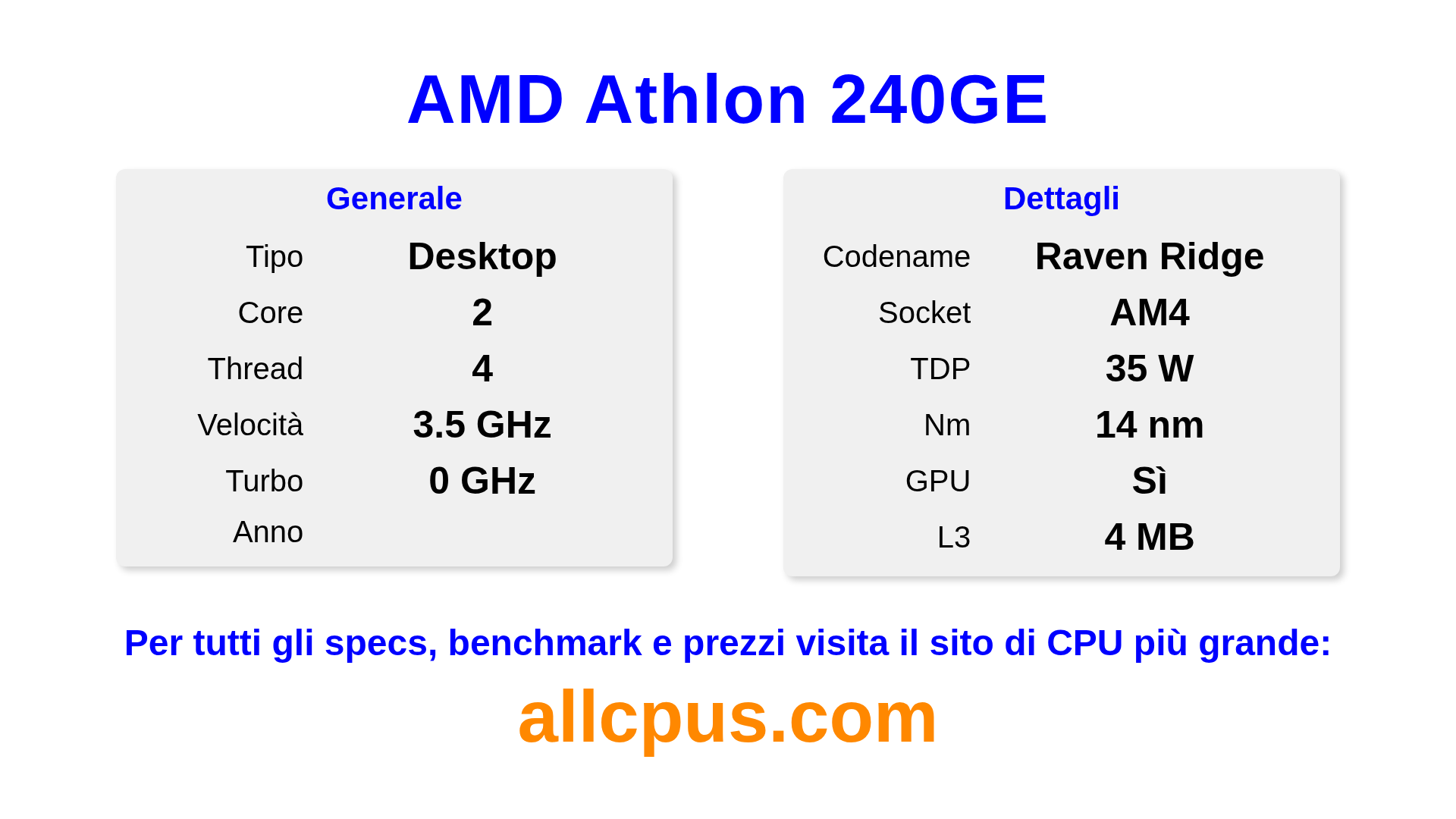 Il AMD Athlon 240GE è un AMD processore desktop della linea Athlon, costruito sull’architettura Raven Ridge e rilasciato nel . Questa CPU ha 2 core, una frequenza base di 3500 MHz, frequenza turbo massima di 0 MHz e 4 MB di cache L3. Prodotto usando tecnologia di processo a 14 nm.Il AMD Athlon 240GE è progettato per il socket AM4. Include la grafica integrata Radeon Vega 3 Graphics.