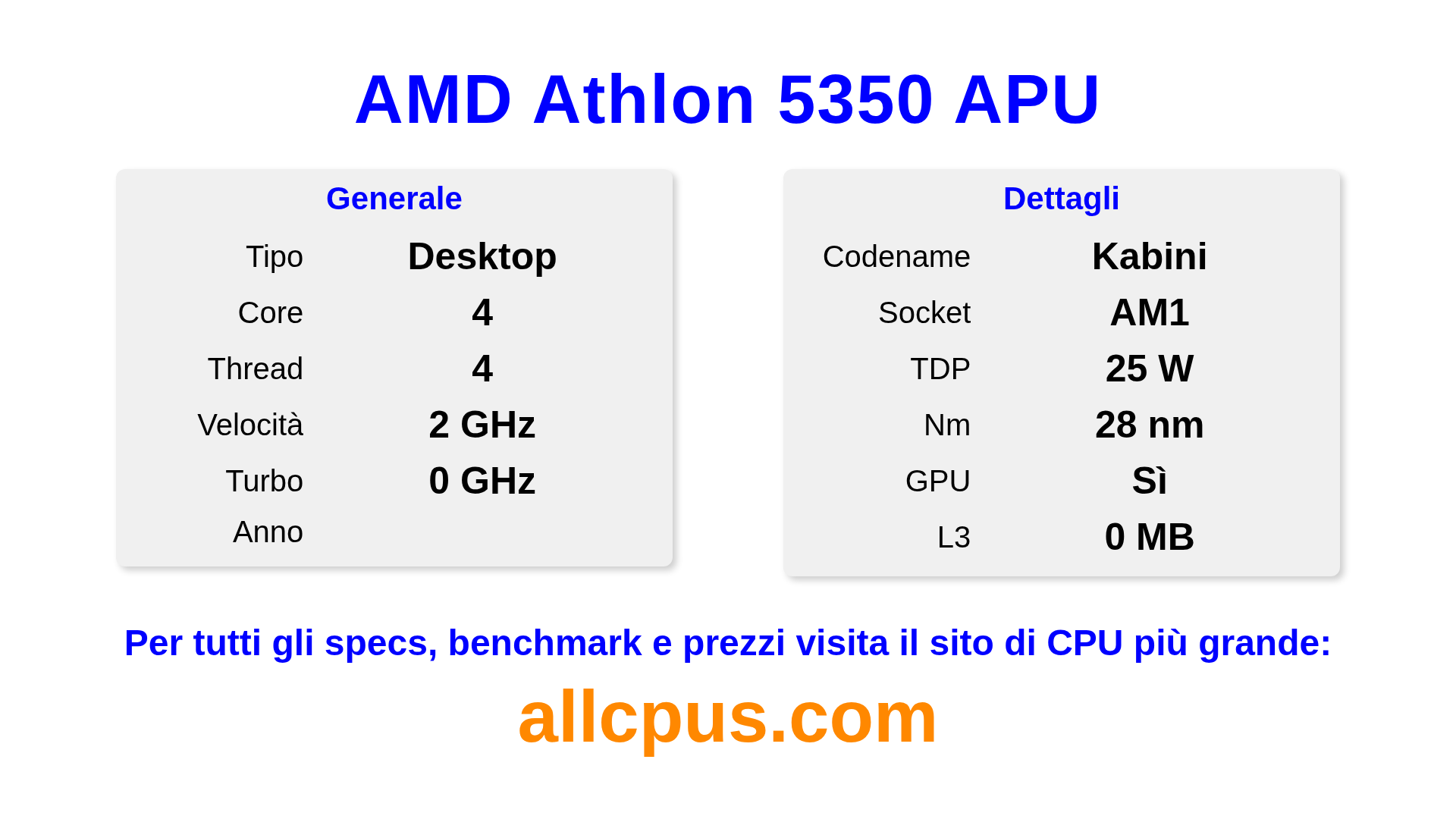Il AMD Athlon 5350 APU è un AMD processore desktop della linea Athlon, costruito sull’architettura Kabini e rilasciato nel . Questa CPU ha 4 core, una frequenza base di 2050 MHz, frequenza turbo massima di 0 MHz e 0 MB di cache L3. Prodotto usando tecnologia di processo a 28 nm.Il AMD Athlon 5350 APU è progettato per il socket AM1. Include la grafica integrata AMD Radeon R3 Graphics.