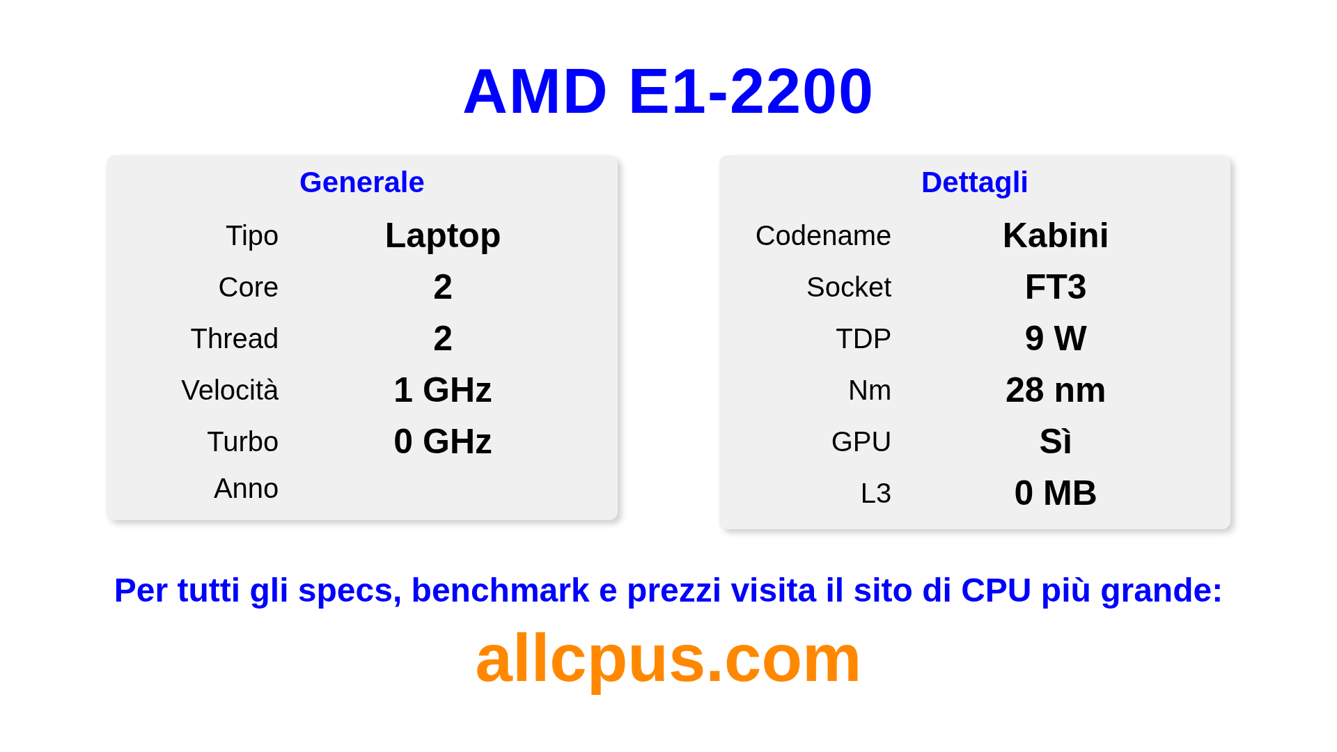 Il AMD E1-2200 è un AMD processore laptop della linea E-Series, costruito sull’architettura Kabini e rilasciato nel . Questa CPU ha 2 core, una frequenza base di 1000 MHz, frequenza turbo massima di 0 MHz e 0 MB di cache L3. Prodotto usando tecnologia di processo a 28 nm.Il AMD E1-2200 è progettato per il socket FT3. Include la grafica integrata AMD Radeon HD 8210.