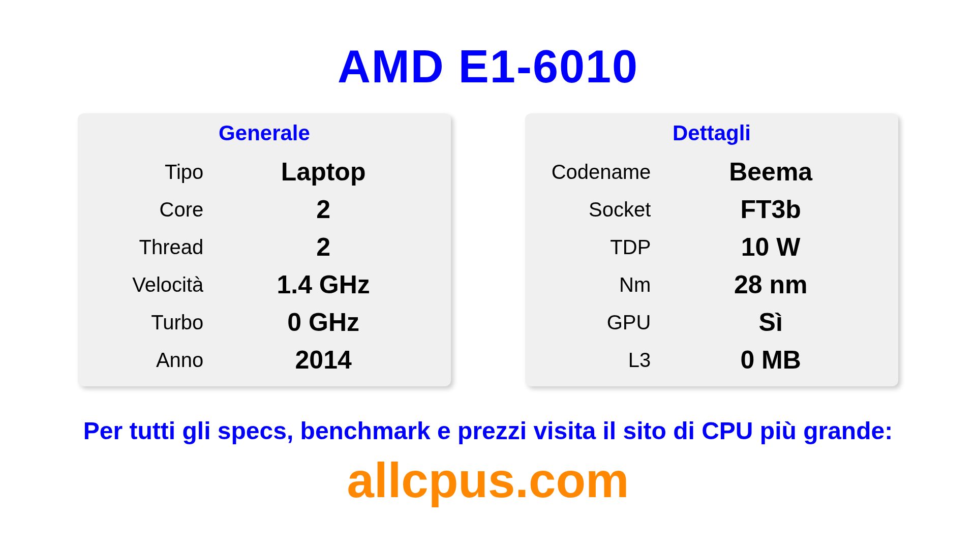 Il AMD E1-6010 è un AMD processore laptop della linea E-Series, costruito sull’architettura Beema e rilasciato nel 2014. Questa CPU ha 2 core, una frequenza base di 1350 MHz, frequenza turbo massima di 0 MHz e 0 MB di cache L3. Prodotto usando tecnologia di processo a 28 nm.Il AMD E1-6010 è progettato per il socket FT3b. Include la grafica integrata AMD Radeon R2 Graphics.