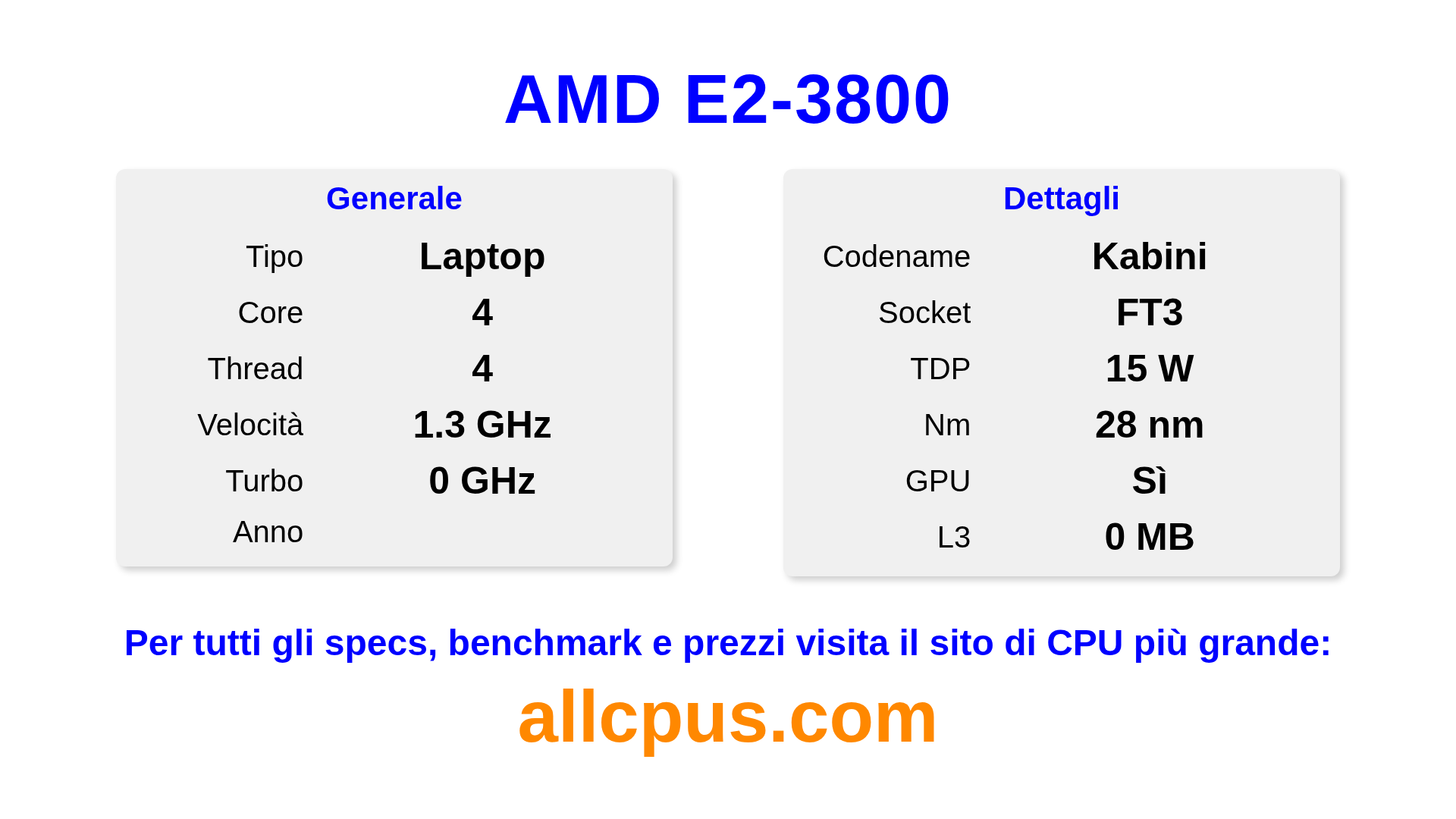 Il AMD E2-3800 è un AMD processore laptop della linea E-Series, costruito sull’architettura Kabini e rilasciato nel . Questa CPU ha 4 core, una frequenza base di 1300 MHz, frequenza turbo massima di 0 MHz e 0 MB di cache L3. Prodotto usando tecnologia di processo a 28 nm.Il AMD E2-3800 è progettato per il socket FT3. Include la grafica integrata AMD Radeon HD 8280.