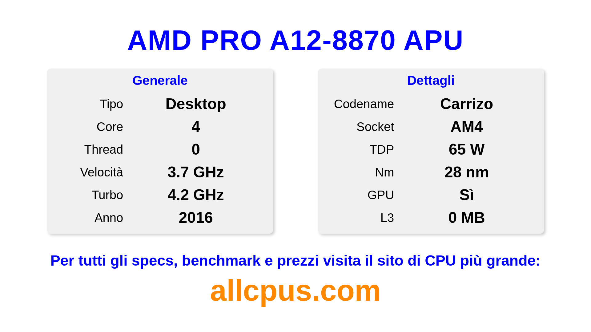 Il AMD PRO A12-8870 APU è un AMD processore desktop della linea PRO A-Series, costruito sull’architettura Carrizo e rilasciato nel 2016. Questa CPU ha 4 core, una frequenza base di 3700 MHz, frequenza turbo massima di 4200 MHz e 0 MB di cache L3. Prodotto usando tecnologia di processo a 28 nm.Il AMD PRO A12-8870 APU è progettato per il socket AM4. Include la grafica integrata R7.