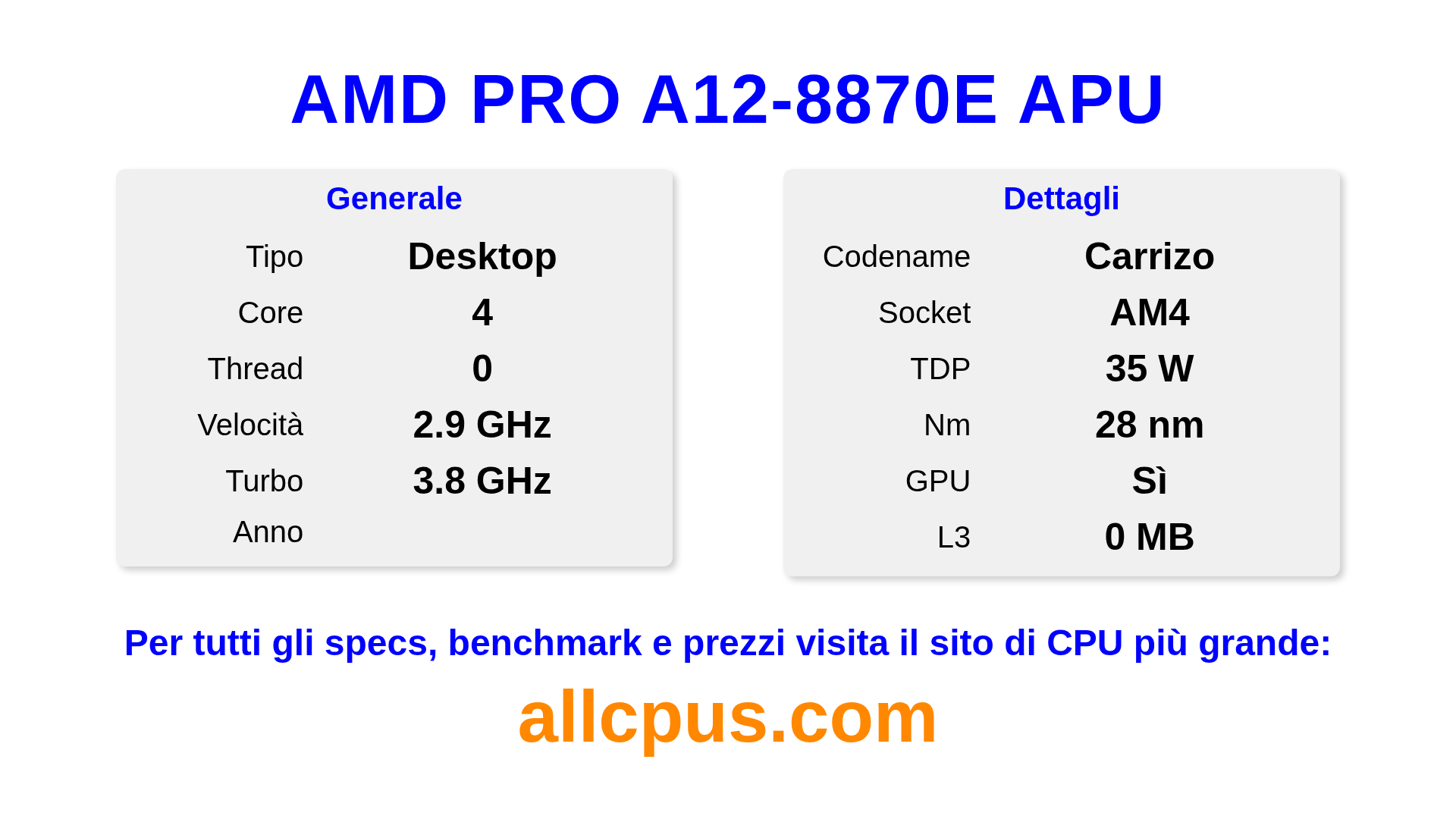 Il AMD PRO A12-8870E APU è un AMD processore desktop della linea PRO A-Series, costruito sull’architettura Carrizo e rilasciato nel . Questa CPU ha 4 core, una frequenza base di 2900 MHz, frequenza turbo massima di 3800 MHz e 0 MB di cache L3. Prodotto usando tecnologia di processo a 28 nm.Il AMD PRO A12-8870E APU è progettato per il socket AM4. Include la grafica integrata R7.