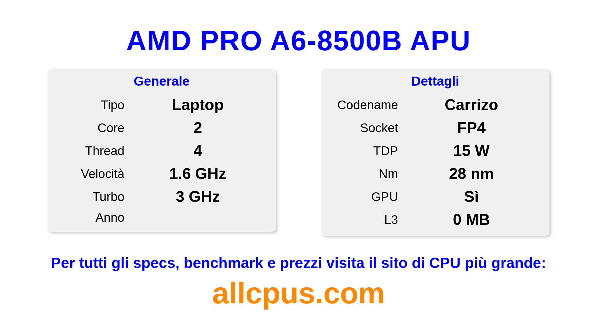 Il AMD PRO A6-8500B APU è un AMD processore laptop della linea PRO A-Series, costruito sull’architettura Carrizo e rilasciato nel . Questa CPU ha 2 core, una frequenza base di 1600 MHz, frequenza turbo massima di 3000 MHz e 0 MB di cache L3. Prodotto usando tecnologia di processo a 28 nm.Il AMD PRO A6-8500B APU è progettato per il socket FP4. Include la grafica integrata AMD Radeon R5 Graphics.