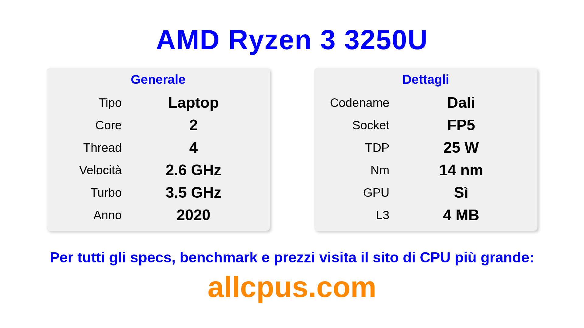 Il AMD Ryzen 3 3250U è un AMD processore laptop della linea Ryzen, costruito sull’architettura Dali e rilasciato nel 2020. Questa CPU ha 2 core, una frequenza base di 2600 MHz, frequenza turbo massima di 3500 MHz e 4 MB di cache L3. Prodotto usando tecnologia di processo a 14 nm.Il AMD Ryzen 3 3250U è progettato per il socket FP5.Supporta l’overclock. Include la grafica integrata AMD Radeon Graphics.