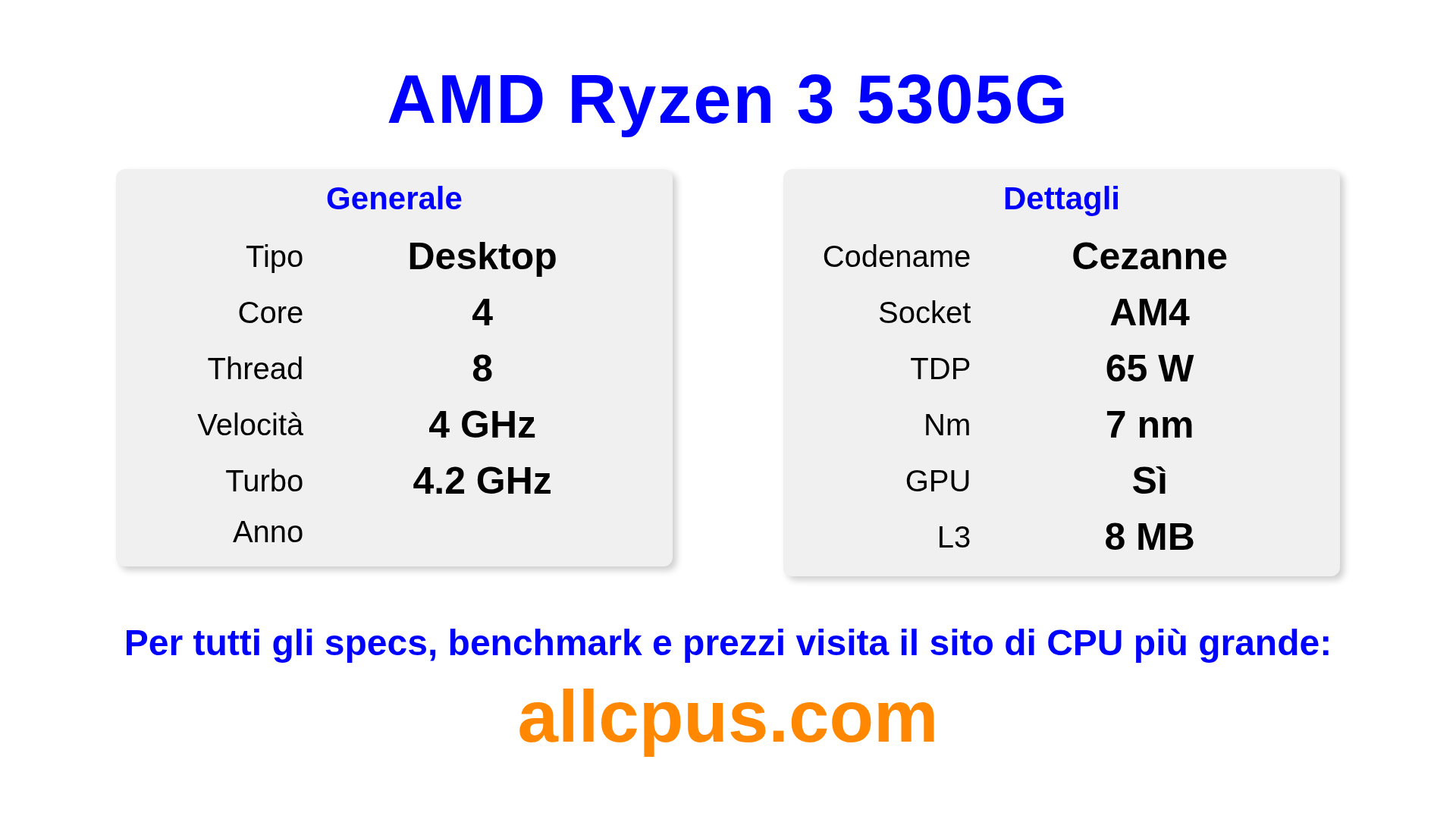 Il AMD Ryzen 3 5305G è un AMD processore desktop della linea Ryzen, costruito sull’architettura Cezanne e rilasciato nel . Questa CPU ha 4 core, una frequenza base di 4000 MHz, frequenza turbo massima di 4200 MHz e 8 MB di cache L3. Prodotto usando tecnologia di processo a 7 nm.Il AMD Ryzen 3 5305G è progettato per il socket AM4.Supporta l’overclock. Include la grafica integrata Radeon Graphics.