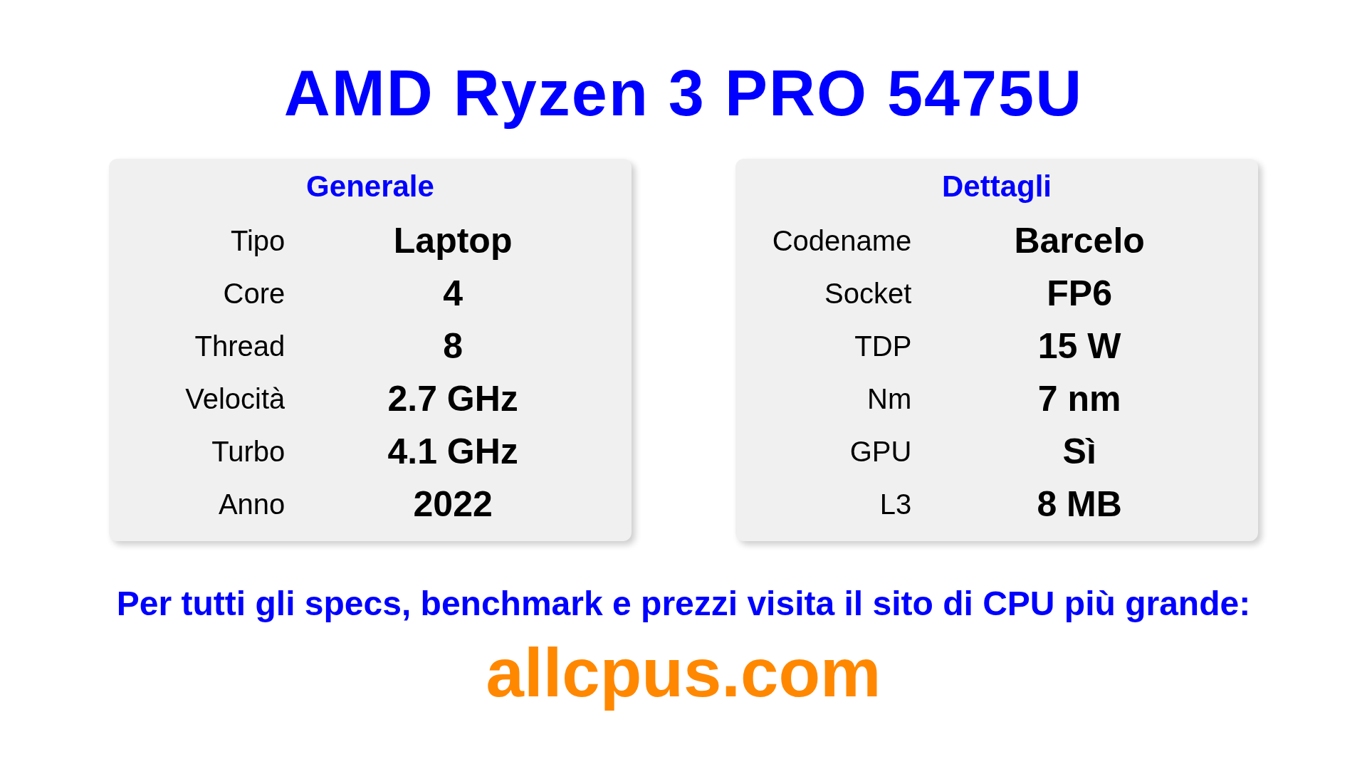 Il AMD Ryzen 3 PRO 5475U è un AMD processore laptop della linea Ryzen PRO, costruito sull’architettura Barcelo e rilasciato nel 2022. Questa CPU ha 4 core, una frequenza base di 2700 MHz, frequenza turbo massima di 4100 MHz e 8 MB di cache L3. Prodotto usando tecnologia di processo a 7 nm.Il AMD Ryzen 3 PRO 5475U è progettato per il socket FP6. Include la grafica integrata AMD Radeon Graphics.
