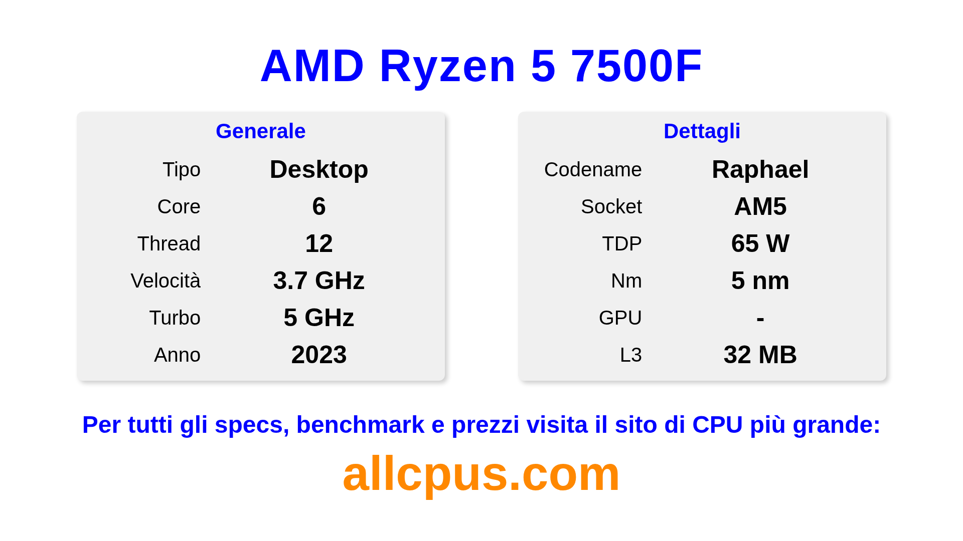 Il AMD Ryzen 5 7500F è un AMD processore desktop della linea Ryzen, costruito sull’architettura Raphael e rilasciato nel 2023. Questa CPU ha 6 core, una frequenza base di 3700 MHz, frequenza turbo massima di 5000 MHz e 32 MB di cache L3. Prodotto usando tecnologia di processo a 5 nm.Il AMD Ryzen 5 7500F è progettato per il socket AM5.Supporta l’overclock. È necessaria una scheda grafica dedicata.