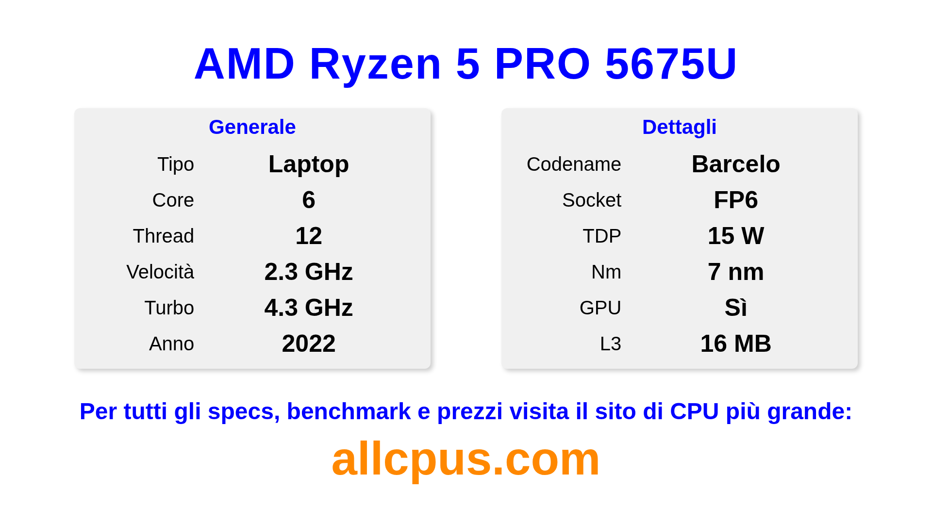 Il AMD Ryzen 5 PRO 5675U è un AMD processore laptop della linea Ryzen PRO, costruito sull’architettura Barcelo e rilasciato nel 2022. Questa CPU ha 6 core, una frequenza base di 2300 MHz, frequenza turbo massima di 4300 MHz e 16 MB di cache L3. Prodotto usando tecnologia di processo a 7 nm.Il AMD Ryzen 5 PRO 5675U è progettato per il socket FP6. Include la grafica integrata AMD Radeon Graphics.