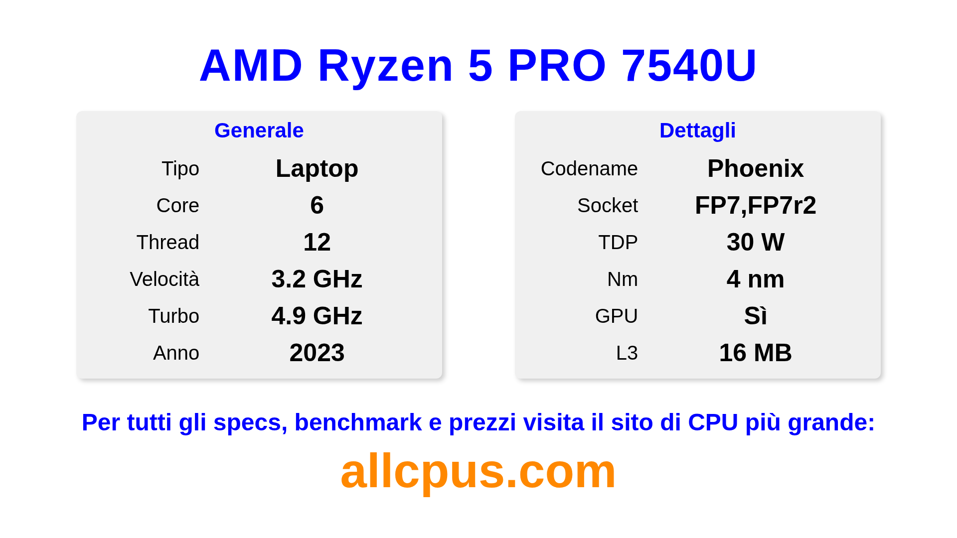Il AMD Ryzen 5 PRO 7540U è un AMD processore laptop della linea Ryzen PRO, costruito sull’architettura Phoenix e rilasciato nel 2023. Questa CPU ha 6 core, una frequenza base di 3200 MHz, frequenza turbo massima di 4900 MHz e 16 MB di cache L3. Prodotto usando tecnologia di processo a 4 nm.Il AMD Ryzen 5 PRO 7540U è progettato per il socket FP7,FP7r2. Include la grafica integrata AMD Radeon 740M.