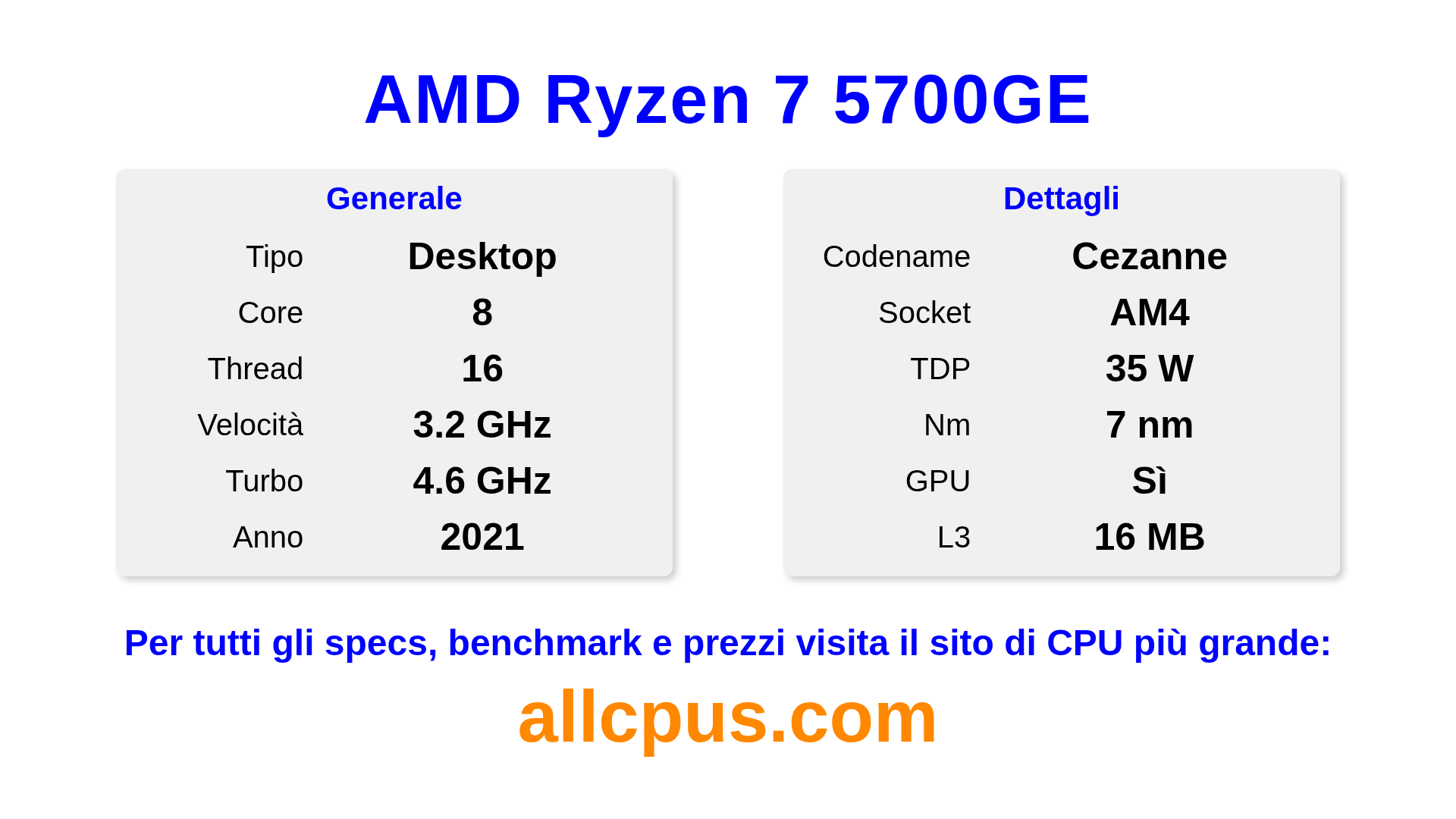 Il AMD Ryzen 7 5700GE è un AMD processore desktop della linea Ryzen, costruito sull’architettura Cezanne e rilasciato nel 2021. Questa CPU ha 8 core, una frequenza base di 3200 MHz, frequenza turbo massima di 4600 MHz e 16 MB di cache L3. Prodotto usando tecnologia di processo a 7 nm.Il AMD Ryzen 7 5700GE è progettato per il socket AM4.Supporta l’overclock. Include la grafica integrata Radeon Graphics.