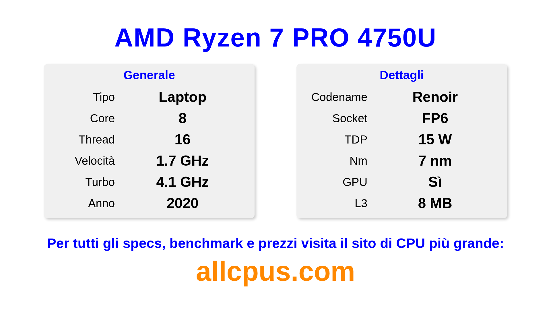 Il AMD Ryzen 7 PRO 4750U è un AMD processore laptop della linea Ryzen PRO, costruito sull’architettura Renoir e rilasciato nel 2020. Questa CPU ha 8 core, una frequenza base di 1700 MHz, frequenza turbo massima di 4100 MHz e 8 MB di cache L3. Prodotto usando tecnologia di processo a 7 nm.Il AMD Ryzen 7 PRO 4750U è progettato per il socket FP6. Include la grafica integrata AMD Radeon Graphics.