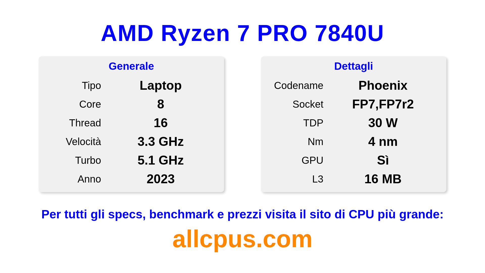 Il AMD Ryzen 7 PRO 7840U è un AMD processore laptop della linea Ryzen PRO, costruito sull’architettura Phoenix e rilasciato nel 2023. Questa CPU ha 8 core, una frequenza base di 3300 MHz, frequenza turbo massima di 5100 MHz e 16 MB di cache L3. Prodotto usando tecnologia di processo a 4 nm.Il AMD Ryzen 7 PRO 7840U è progettato per il socket FP7,FP7r2. Include la grafica integrata AMD Radeon 780M.