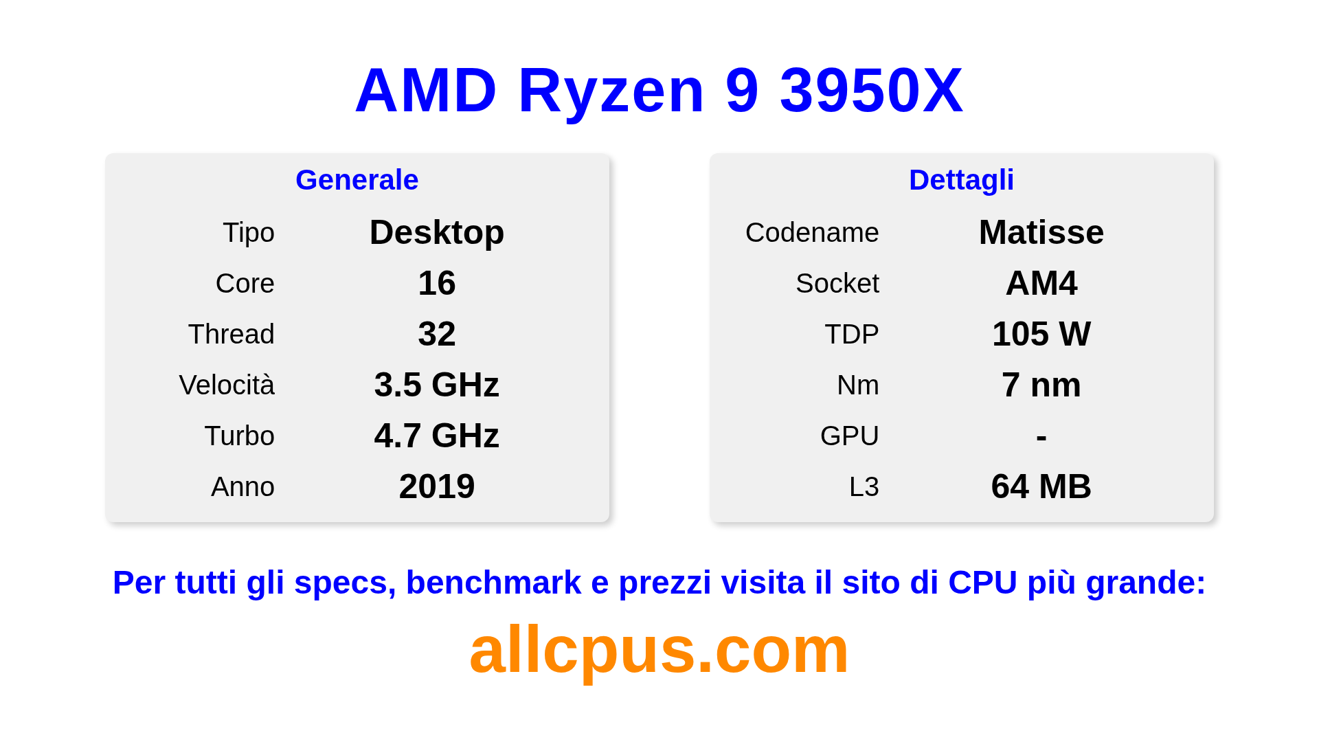 Il AMD Ryzen 9 3950X è un AMD processore desktop della linea Ryzen, costruito sull’architettura Matisse e rilasciato nel 2019. Questa CPU ha 16 core, una frequenza base di 3500 MHz, frequenza turbo massima di 4700 MHz e 64 MB di cache L3. Prodotto usando tecnologia di processo a 7 nm.Il AMD Ryzen 9 3950X è progettato per il socket AM4.Supporta l’overclock. È necessaria una scheda grafica dedicata.