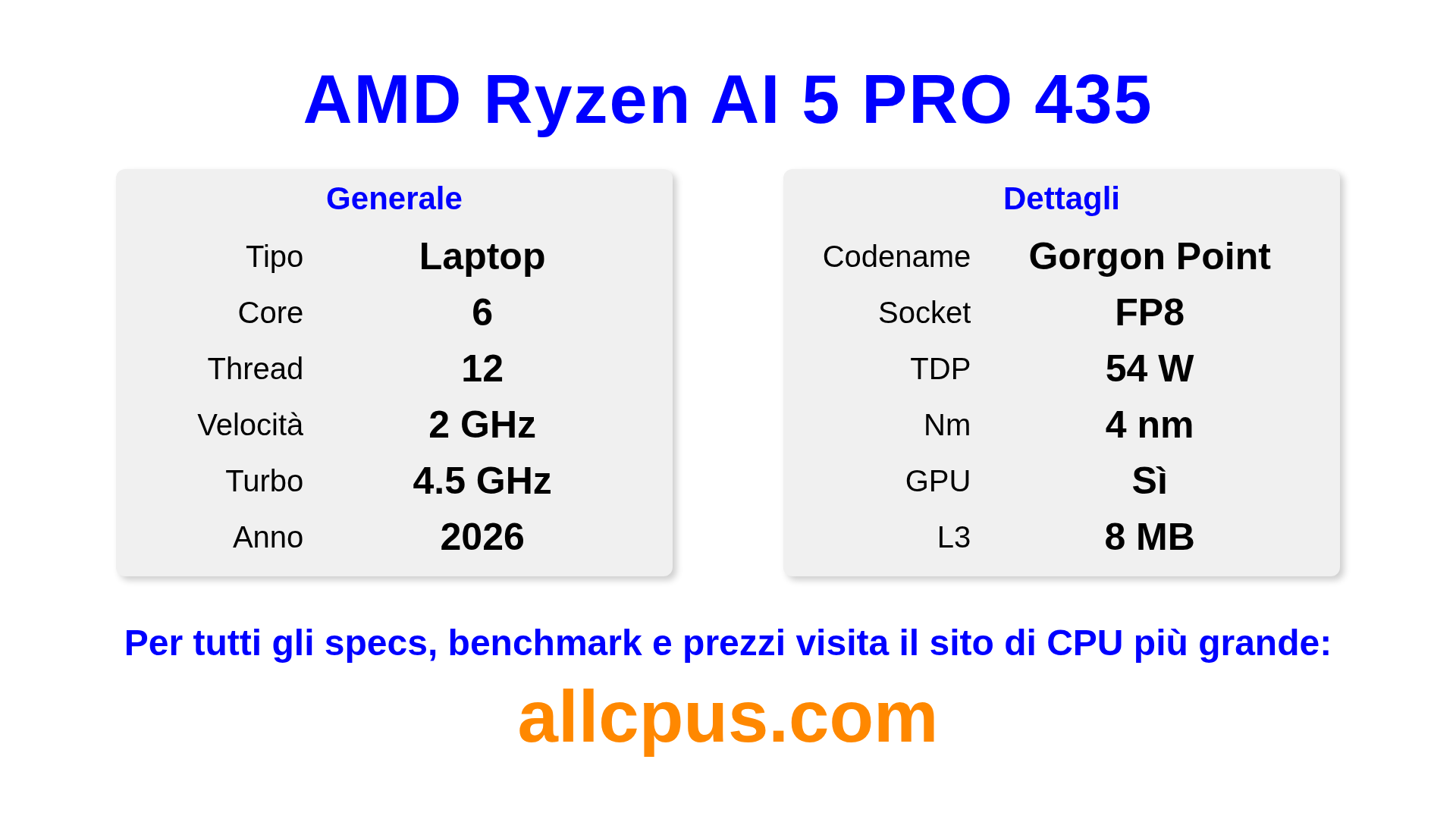 Il AMD Ryzen AI 5 PRO 435 è un AMD processore laptop della linea Ryzen PRO, costruito sull’architettura Gorgon Point e rilasciato nel 2026. Questa CPU ha 6 core, una frequenza base di 2000 MHz, frequenza turbo massima di 4500 MHz e 8 MB di cache L3. Prodotto usando tecnologia di processo a 4 nm.Il AMD Ryzen AI 5 PRO 435 è progettato per il socket FP8.Supporta l’overclock. Include la grafica integrata AMD Radeon 840M.