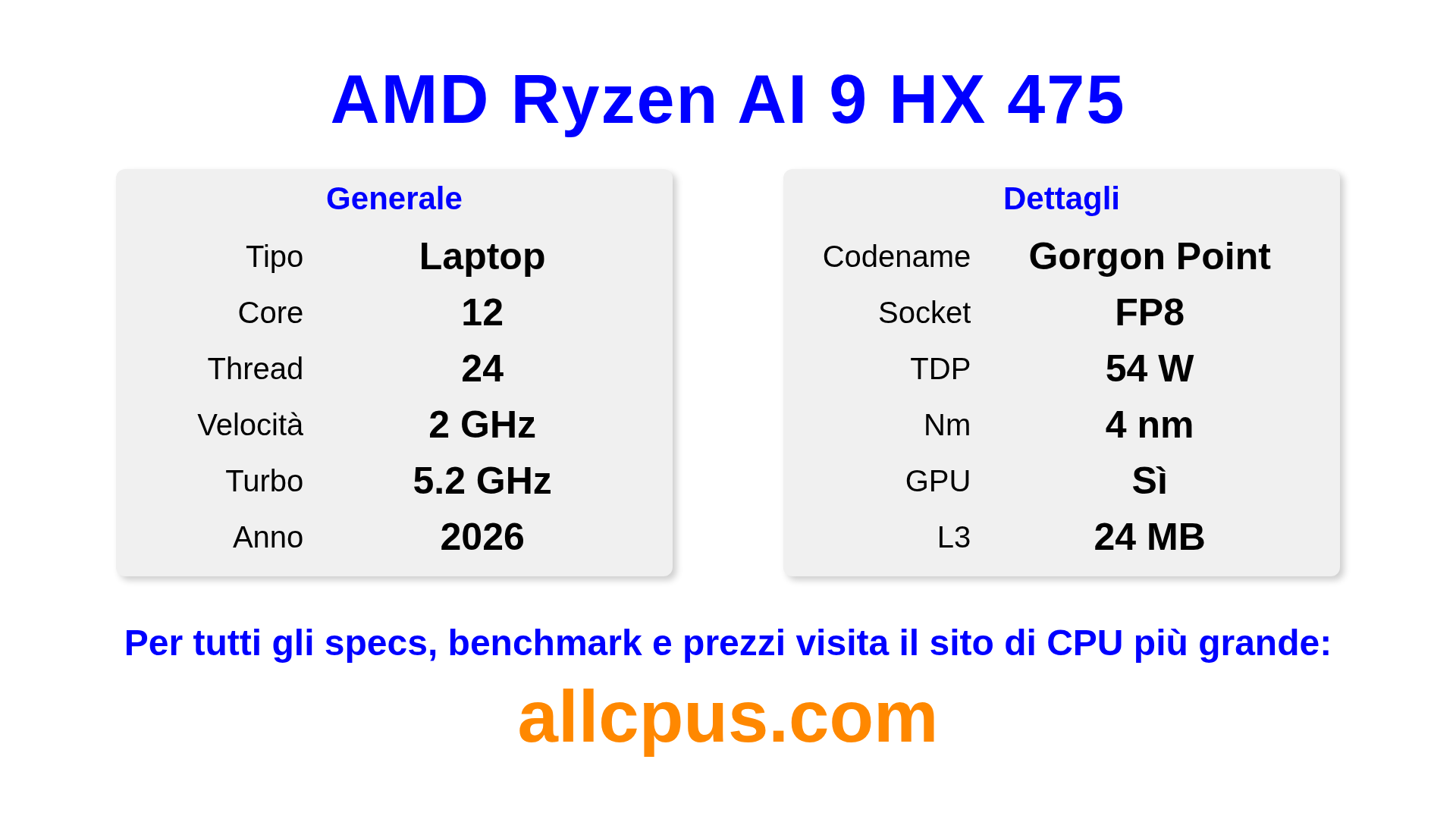 Il AMD Ryzen AI 9 HX 475 è un AMD processore laptop della linea Ryzen, costruito sull’architettura Gorgon Point e rilasciato nel 2026. Questa CPU ha 12 core, una frequenza base di 2000 MHz, frequenza turbo massima di 5200 MHz e 24 MB di cache L3. Prodotto usando tecnologia di processo a 4 nm.Il AMD Ryzen AI 9 HX 475 è progettato per il socket FP8.Supporta l’overclock. Include la grafica integrata AMD Radeon 890M.