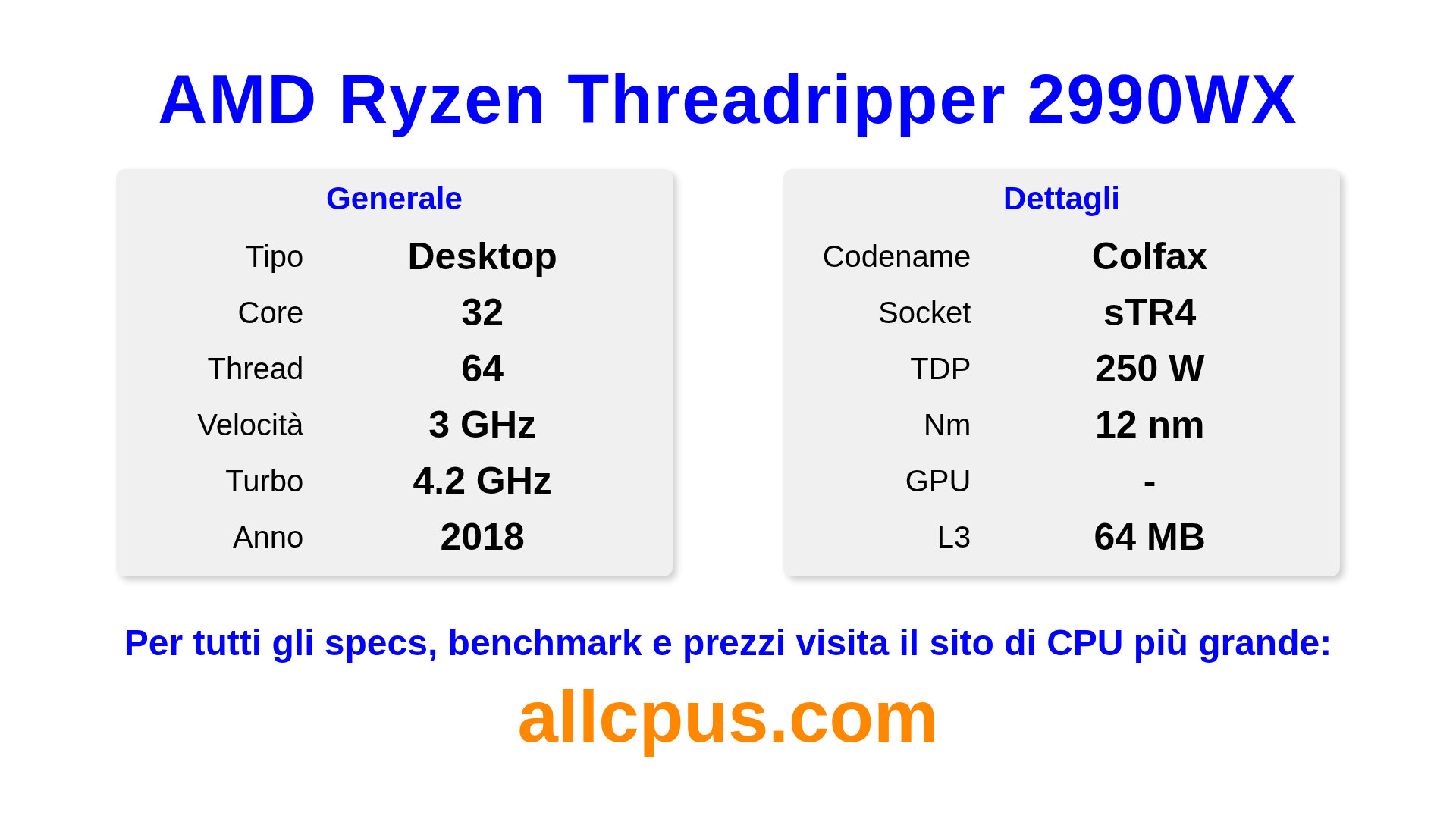 Il AMD Ryzen Threadripper 2990WX è un AMD processore desktop della linea Ryzen Threadripper, costruito sull’architettura Colfax e rilasciato nel 2018. Questa CPU ha 32 core, una frequenza base di 3000 MHz, frequenza turbo massima di 4200 MHz e 64 MB di cache L3. Prodotto usando tecnologia di processo a 12 nm.Il AMD Ryzen Threadripper 2990WX è progettato per il socket sTR4.Supporta l’overclock. È necessaria una scheda grafica dedicata.