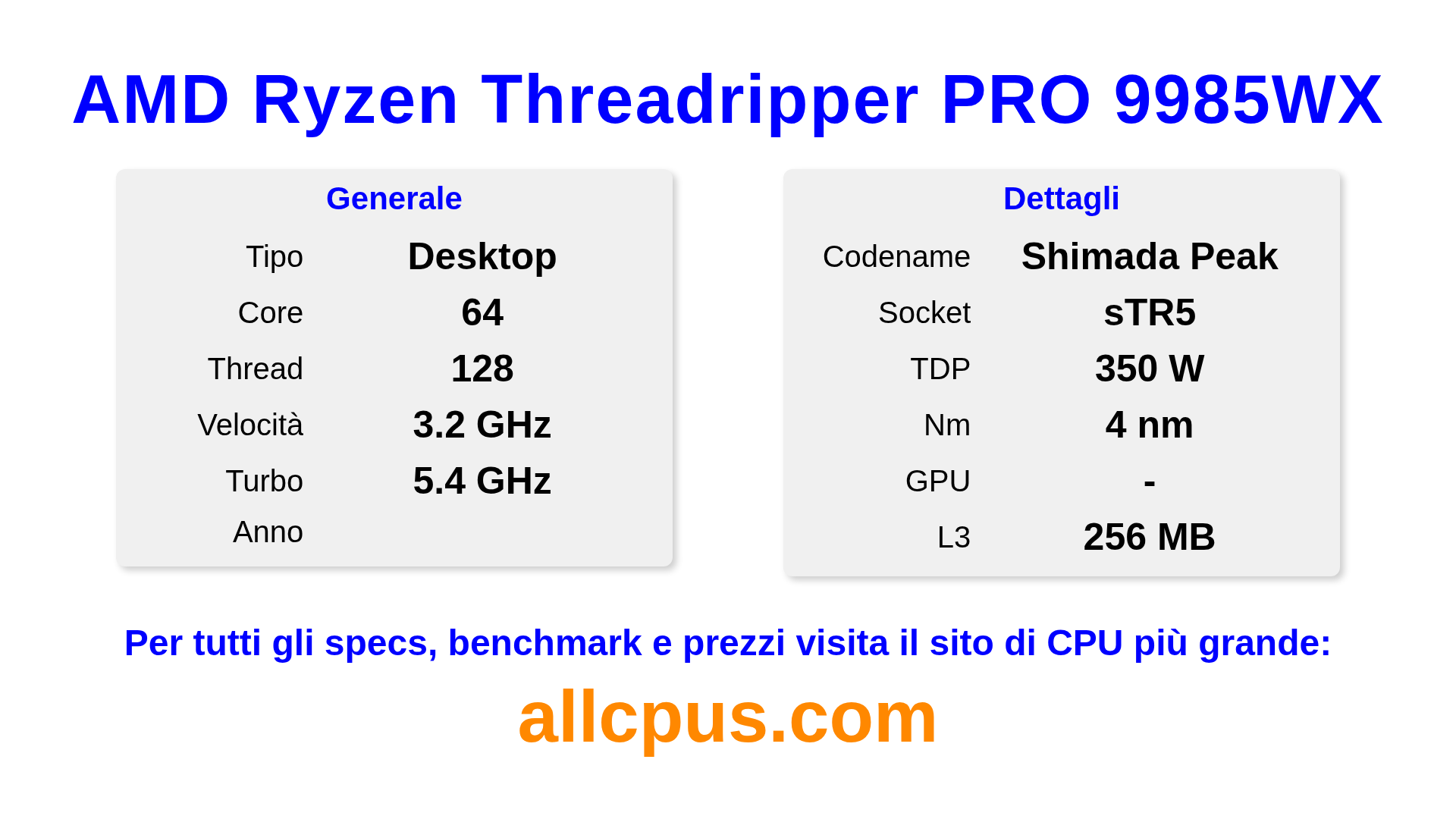 Il AMD Ryzen Threadripper PRO 9985WX è un AMD processore desktop della linea Ryzen Threadripper PRO, costruito sull’architettura Shimada Peak e rilasciato nel . Questa CPU ha 64 core, una frequenza base di 3200 MHz, frequenza turbo massima di 5400 MHz e 256 MB di cache L3. Prodotto usando tecnologia di processo a 4 nm.Il AMD Ryzen Threadripper PRO 9985WX è progettato per il socket sTR5.Supporta l’overclock. È necessaria una scheda grafica dedicata.