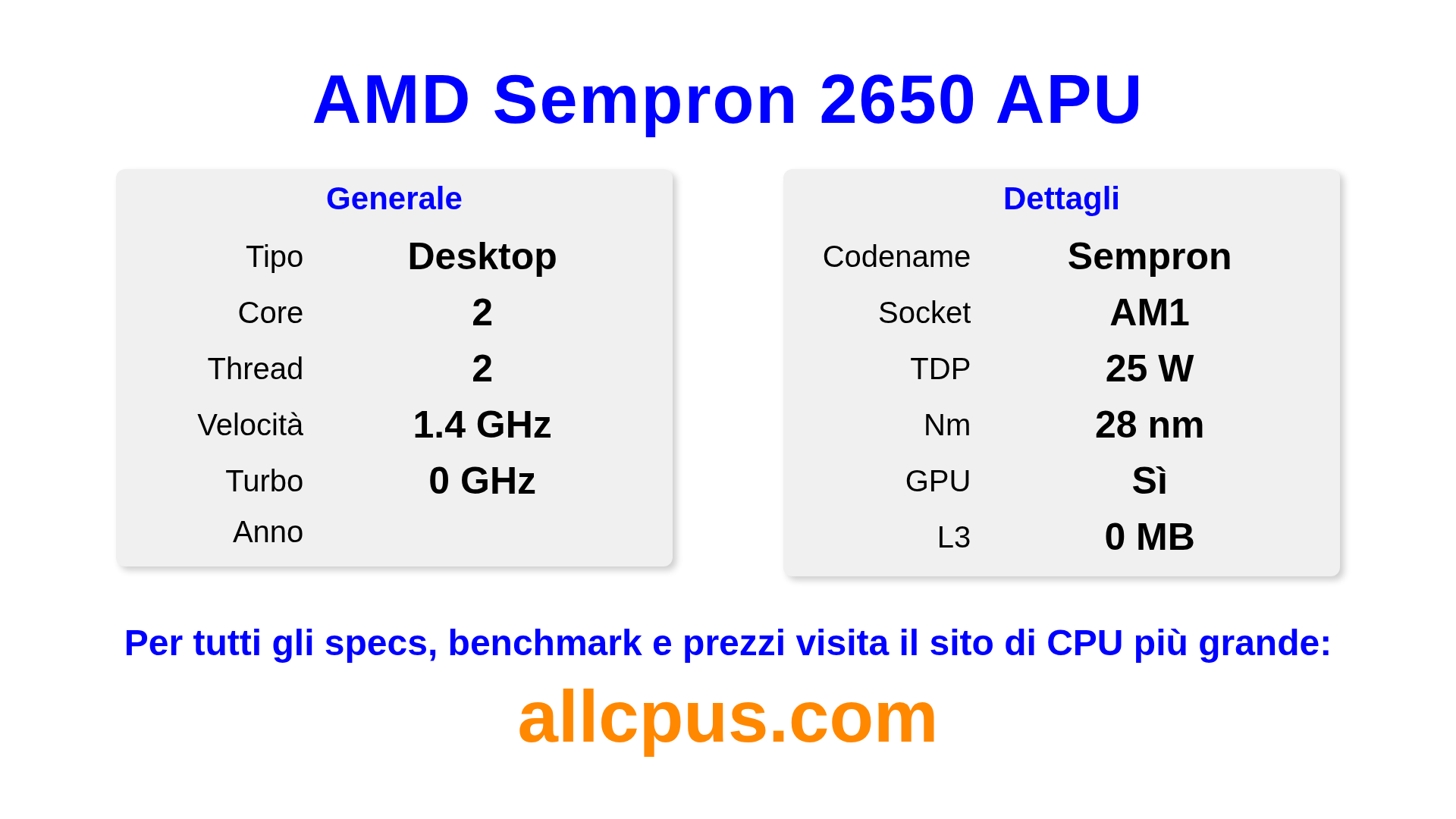 Il AMD Sempron 2650 APU è un AMD processore desktop della linea Sempron, costruito sull’architettura Sempron e rilasciato nel . Questa CPU ha 2 core, una frequenza base di 1450 MHz, frequenza turbo massima di 0 MHz e 0 MB di cache L3. Prodotto usando tecnologia di processo a 28 nm.Il AMD Sempron 2650 APU è progettato per il socket AM1. Include la grafica integrata AMD Radeon R3 Graphics.