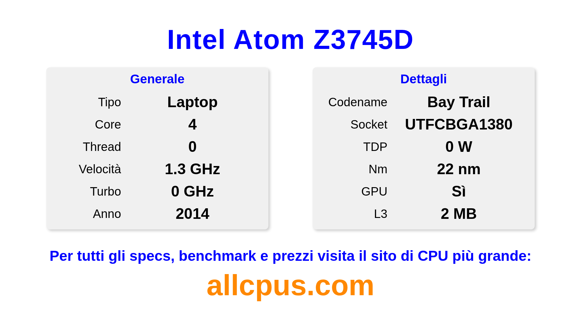 Il Intel Atom Z3745D è un Intel processore laptop della linea Intel Atom Processor Family, costruito sull’architettura Bay Trail e rilasciato nel 2014. Questa CPU ha 4 core, una frequenza base di 1330 MHz, frequenza turbo massima di 0 MHz e 2 MB di cache L3. Prodotto usando tecnologia di processo a 22 nm.Il Intel Atom Z3745D è progettato per il socket UTFCBGA1380. Include la grafica integrata Intel® HD Graphics for Intel Atom® Processor Z3700 Series.