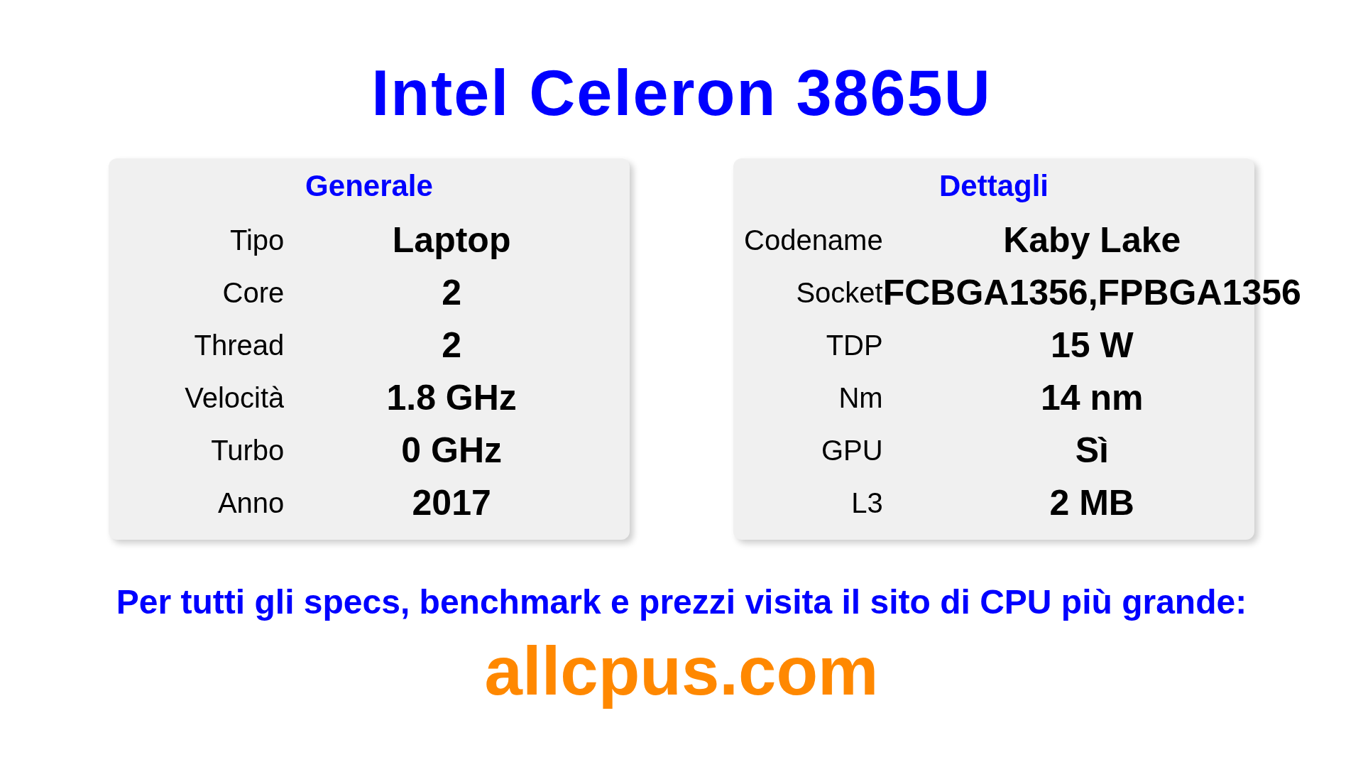 Il Intel Celeron 3865U è un Intel processore laptop della linea Intel® Celeron®, costruito sull’architettura Kaby Lake e rilasciato nel 2017. Questa CPU ha 2 core, una frequenza base di 1800 MHz, frequenza turbo massima di 0 MHz e 2 MB di cache L3. Prodotto usando tecnologia di processo a 14 nm.Il Intel Celeron 3865U è progettato per il socket BGA1356,FPBGA1356. Include la grafica integrata Intel® HD Graphics 610.
