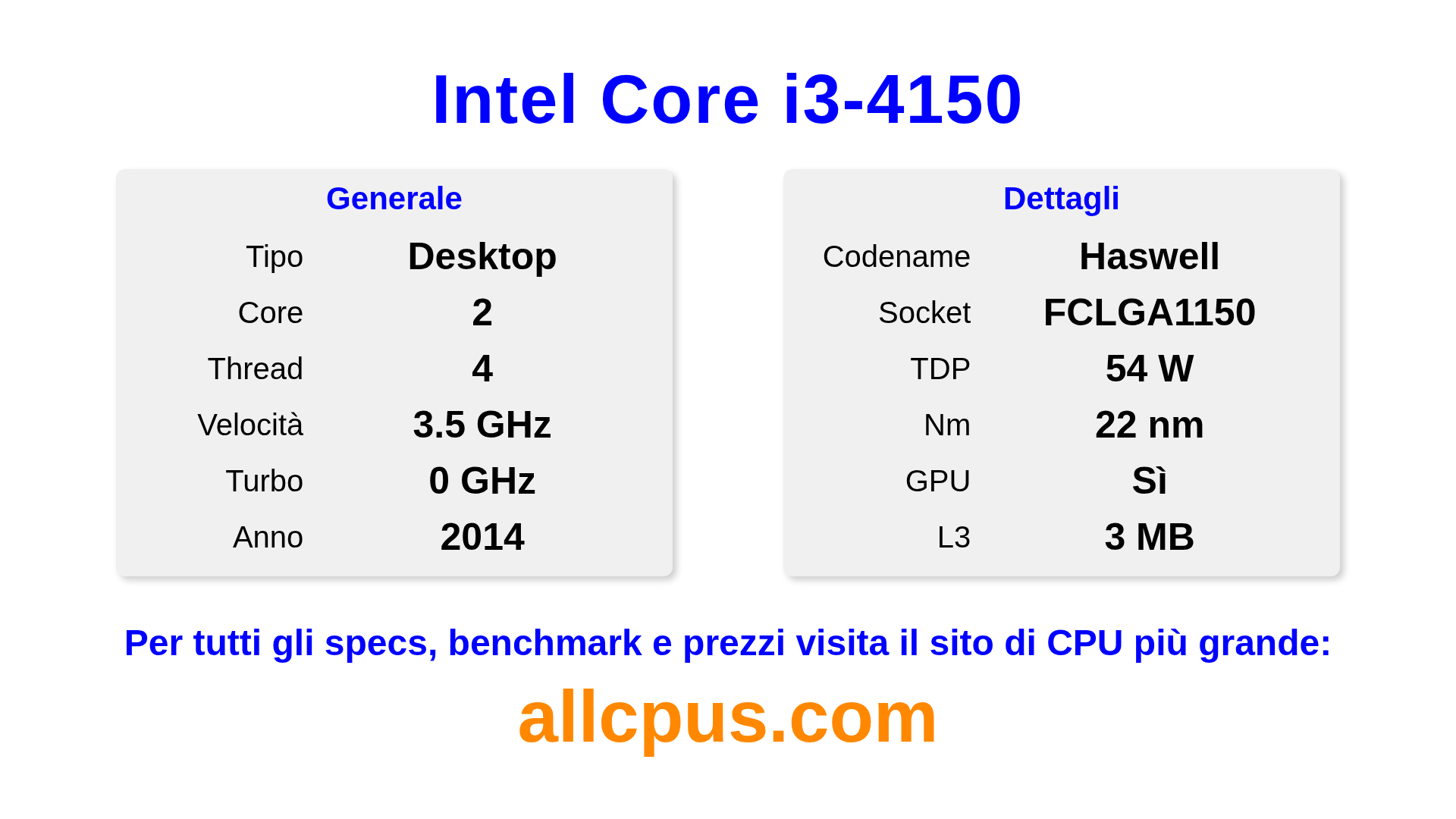 Il Intel Core i3-4150 è un Intel processore desktop della linea Intel Core, costruito sull’architettura Haswell e rilasciato nel 2014. Questa CPU ha 2 core, una frequenza base di 3500 MHz, frequenza turbo massima di 0 MHz e 3 MB di cache L3. Prodotto usando tecnologia di processo a 22 nm.Il Intel Core i3-4150 è progettato per il socket LGA1150. Include la grafica integrata Intel® HD Graphics 4400.