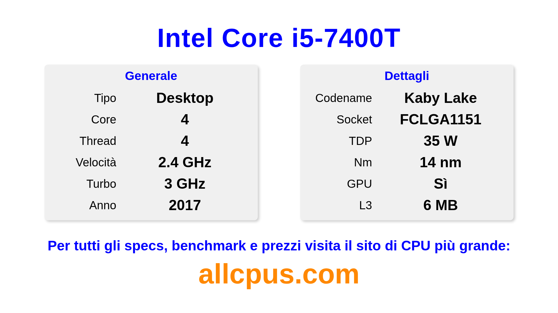 Il Intel Core i5-7400T è un Intel processore desktop della linea Intel Core, costruito sull’architettura Kaby Lake e rilasciato nel 2017. Questa CPU ha 4 core, una frequenza base di 2400 MHz, frequenza turbo massima di 3000 MHz e 6 MB di cache L3. Prodotto usando tecnologia di processo a 14 nm.Il Intel Core i5-7400T è progettato per il socket LGA1151. Include la grafica integrata Intel® HD Graphics 630.