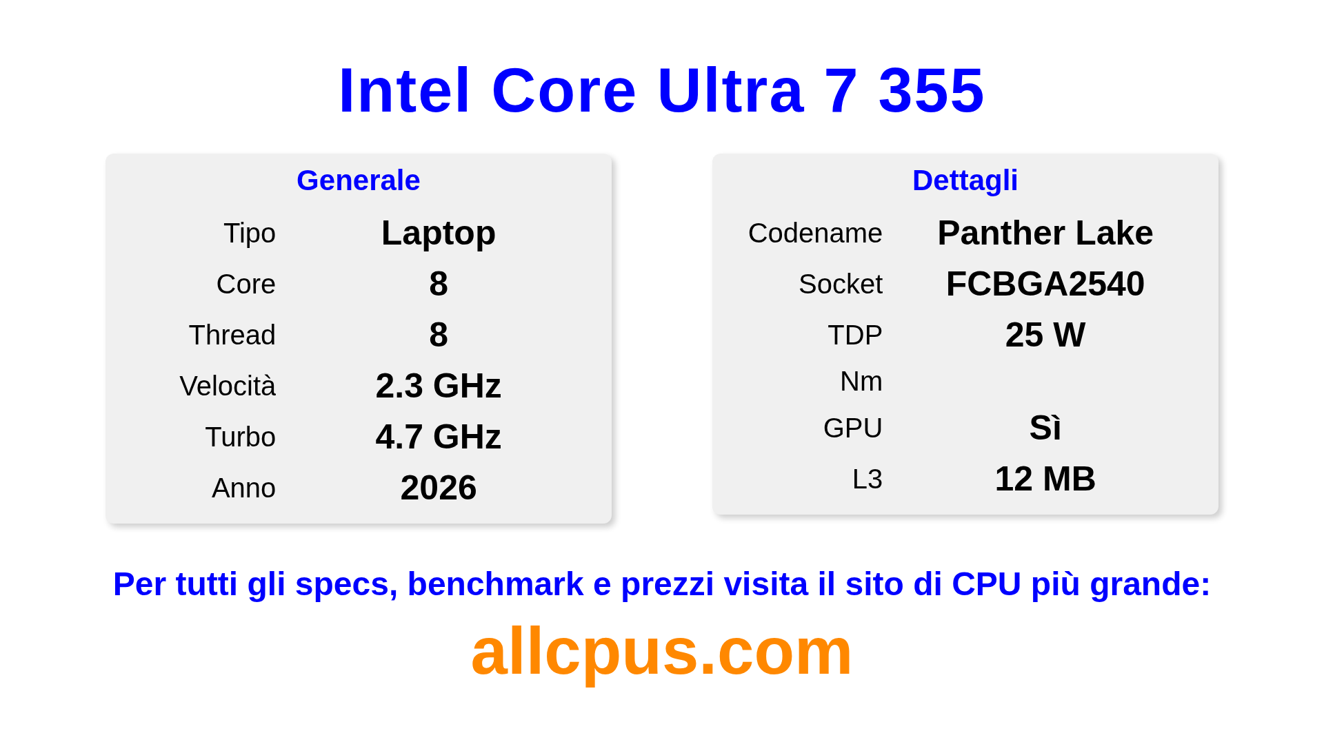 Il Intel Core Ultra 7 355 è un Intel processore laptop della linea Intel Core Ultra, costruito sull’architettura Panther Lake e rilasciato nel 2026. Questa CPU ha 8 core, una frequenza base di 2300 MHz, frequenza turbo massima di 4700 MHz e 12 MB di cache L3. Il Intel Core Ultra 7 355 è progettato per il socket BGA2540. Include la grafica integrata Intel® Graphics.