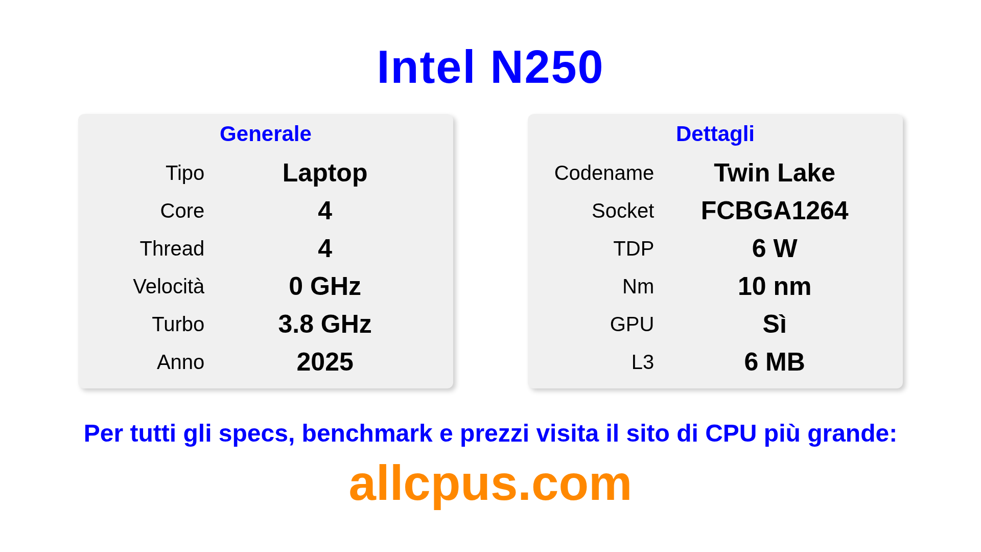 Il Intel N250 è un Intel processore laptop della linea Intel Processor, costruito sull’architettura Twin Lake e rilasciato nel 2025. Questa CPU ha 4 core, una frequenza base di 0 MHz, frequenza turbo massima di 3800 MHz e 6 MB di cache L3. Prodotto usando tecnologia di processo a 10 nm.Il Intel N250 è progettato per il socket BGA1264. Include la grafica integrata Intel® Graphics.