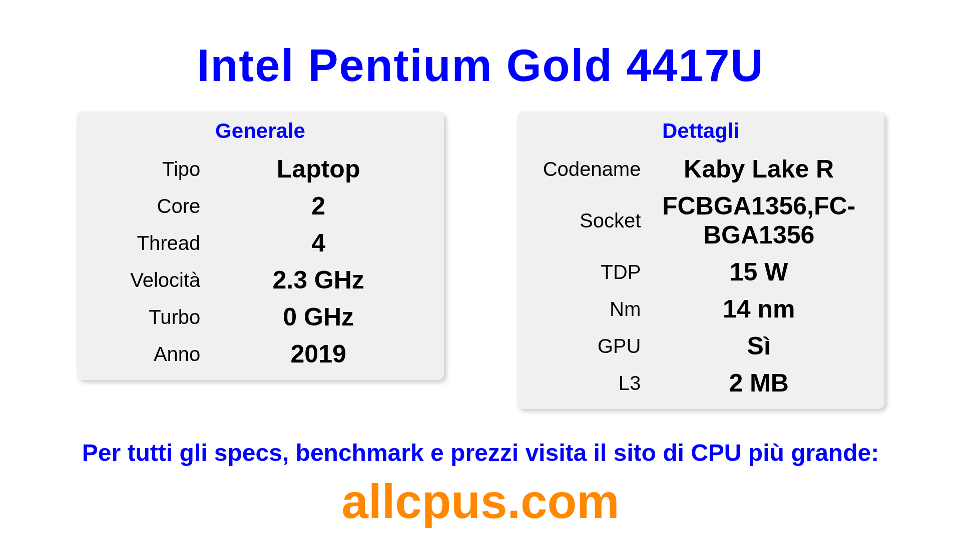 Il Intel Pentium Gold 4417U è un Intel processore laptop della linea Intel® Pentium® Gold, costruito sull’architettura Kaby Lake R e rilasciato nel 2019. Questa CPU ha 2 core, una frequenza base di 2300 MHz, frequenza turbo massima di 0 MHz e 2 MB di cache L3. Prodotto usando tecnologia di processo a 14 nm.Il Intel Pentium Gold 4417U è progettato per il socket BGA1356,FC-BGA1356. Include la grafica integrata Intel® HD Graphics 610.