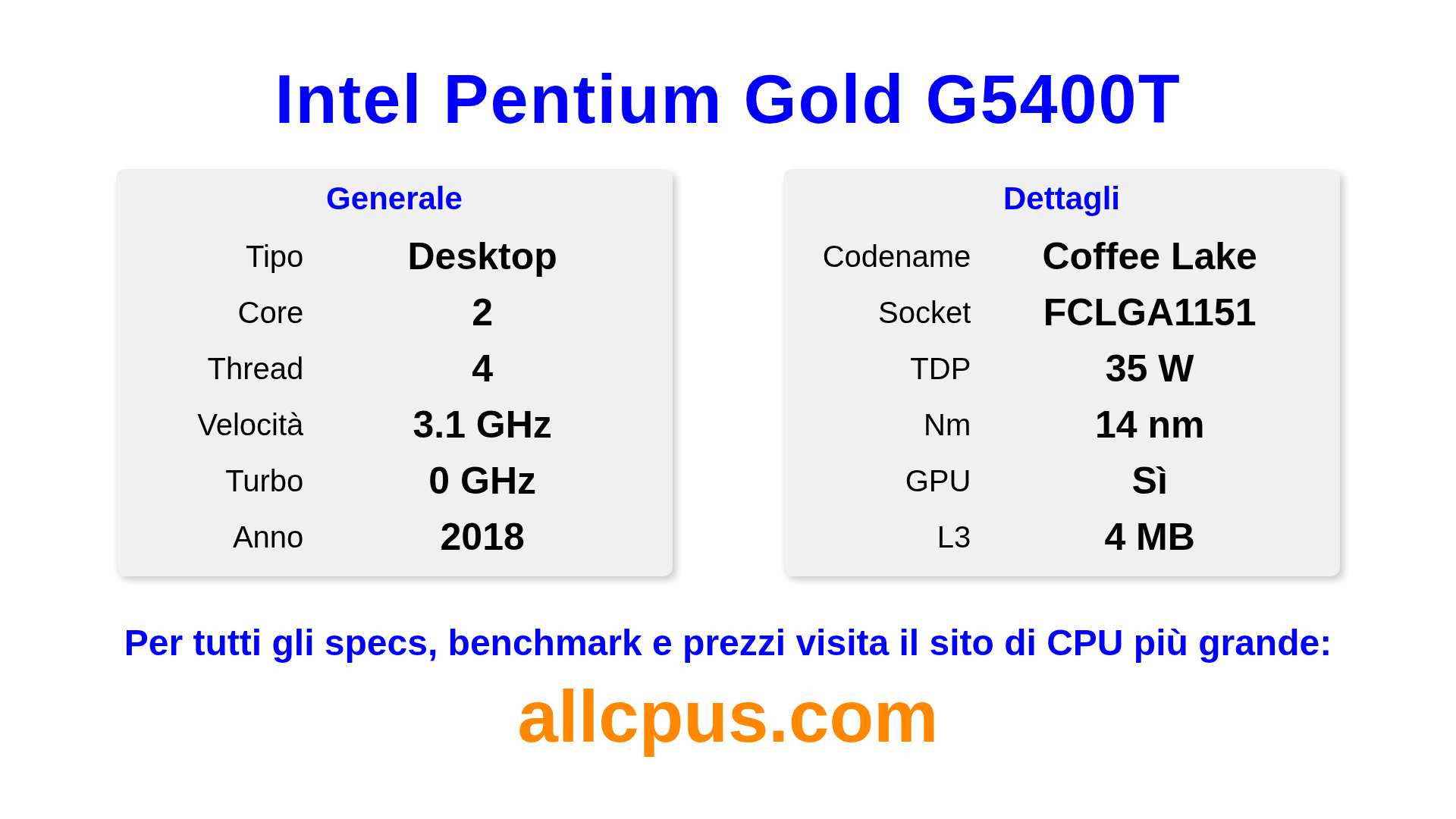 Il Intel Pentium Gold G5400T è un Intel processore desktop della linea Intel® Pentium® Gold, costruito sull’architettura Coffee Lake e rilasciato nel 2018. Questa CPU ha 2 core, una frequenza base di 3100 MHz, frequenza turbo massima di 0 MHz e 4 MB di cache L3. Prodotto usando tecnologia di processo a 14 nm.Il Intel Pentium Gold G5400T è progettato per il socket LGA1151. Include la grafica integrata Intel® UHD Graphics 610.
