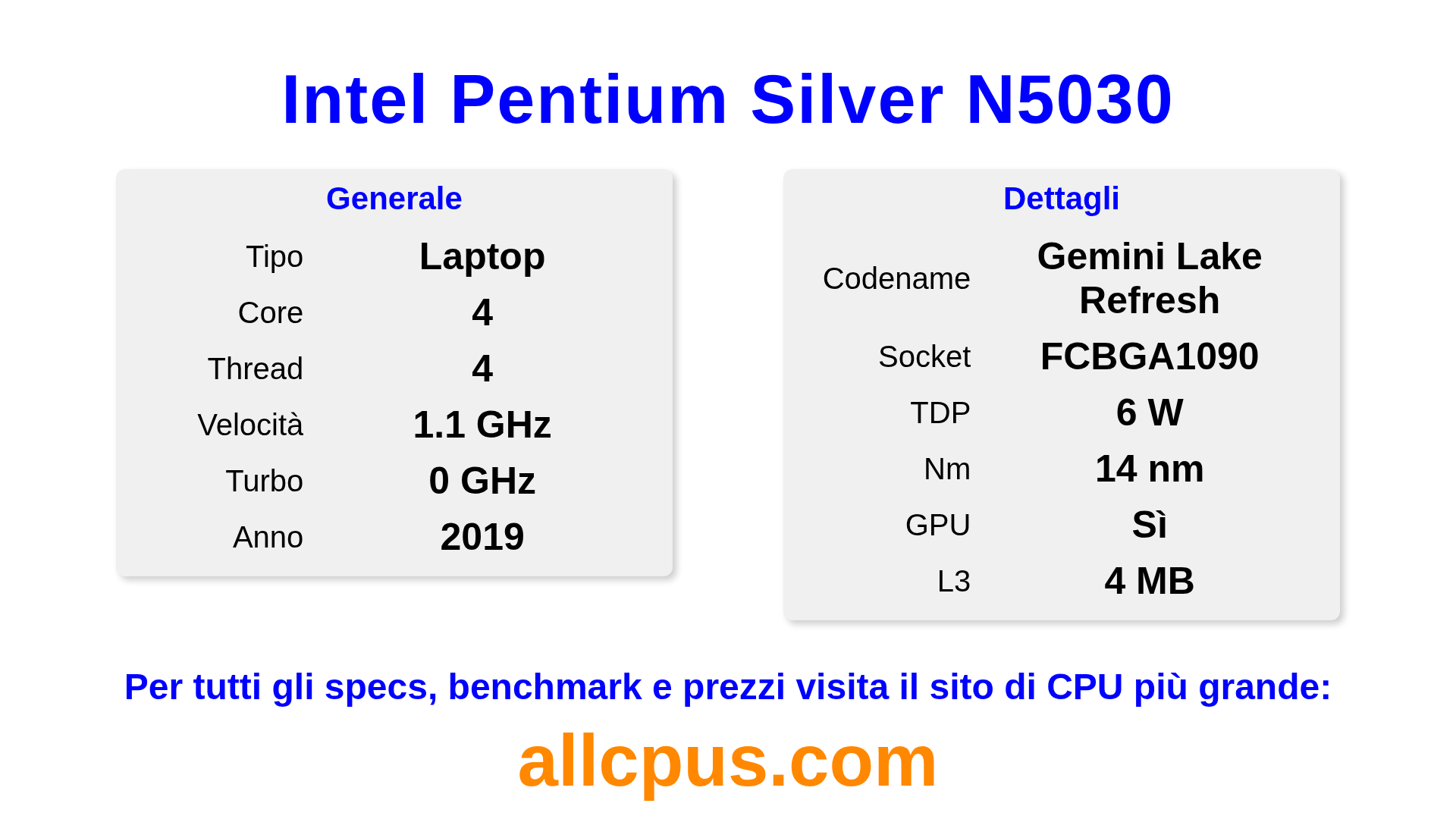 Il Intel Pentium Silver N5030 è un Intel processore laptop della linea Intel® Pentium® Silver, costruito sull’architettura Gemini Lake Refresh e rilasciato nel 2019. Questa CPU ha 4 core, una frequenza base di 1100 MHz, frequenza turbo massima di 0 MHz e 4 MB di cache L3. Prodotto usando tecnologia di processo a 14 nm.Il Intel Pentium Silver N5030 è progettato per il socket BGA1090. Include la grafica integrata Intel® UHD Graphics 605.
